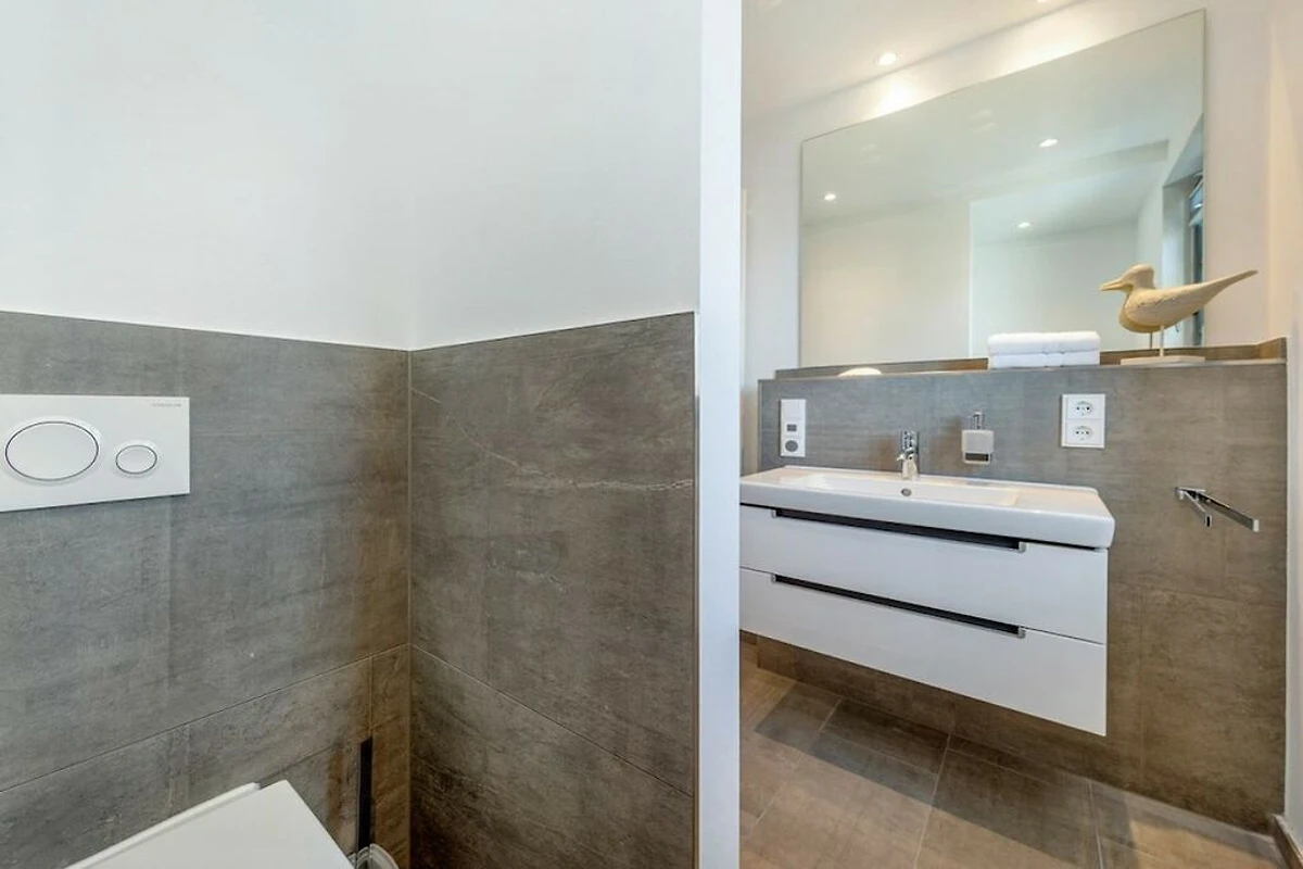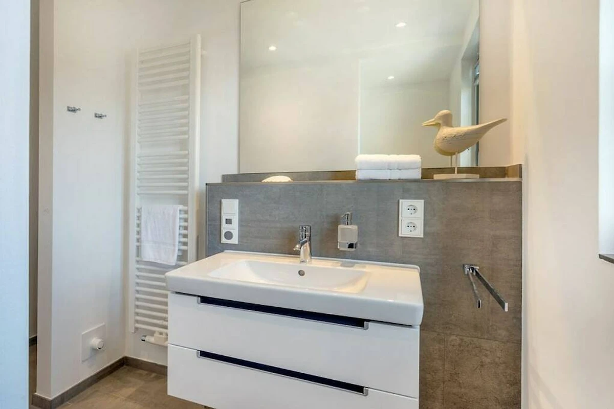 Das Badezimmer mit Dusche verfügt über neben einer Fußbodenheizung auch über ein eingebautes Radio.
