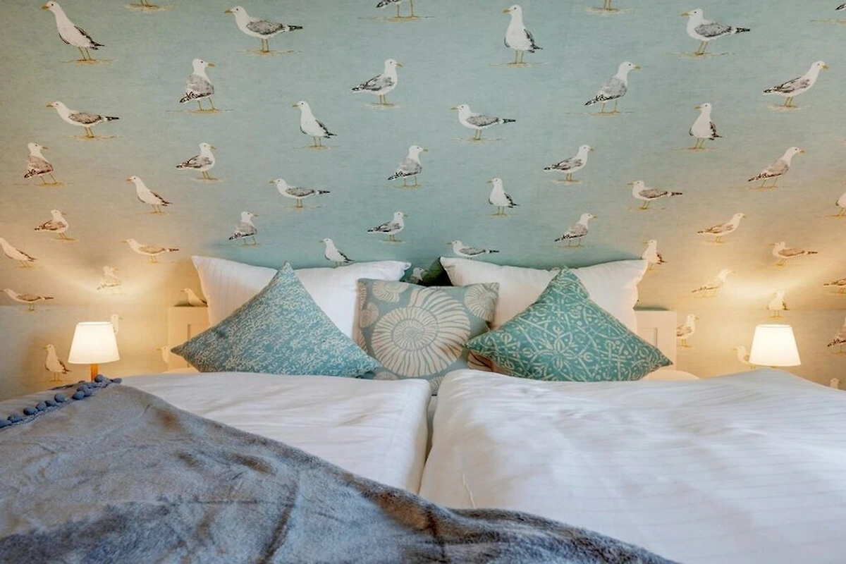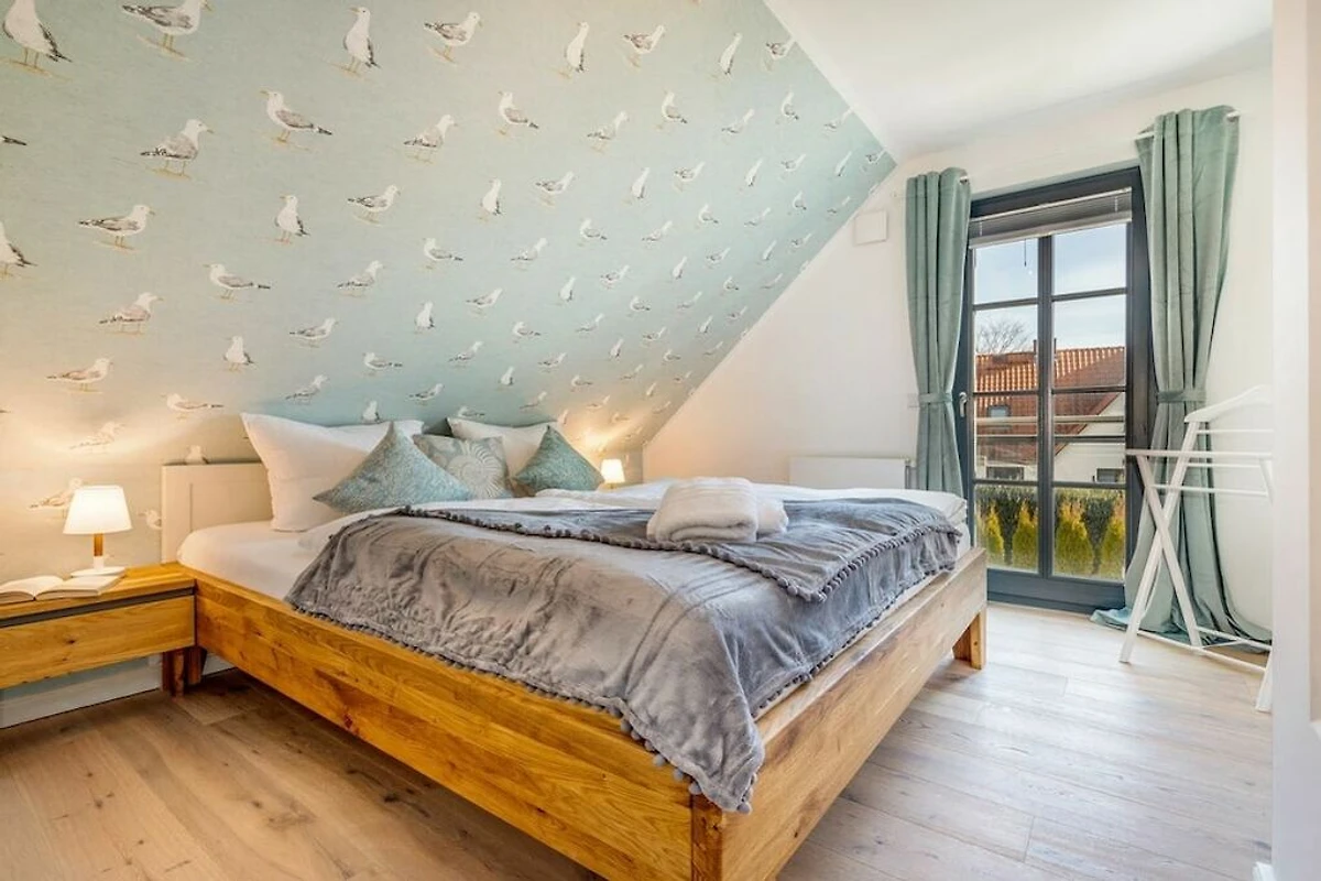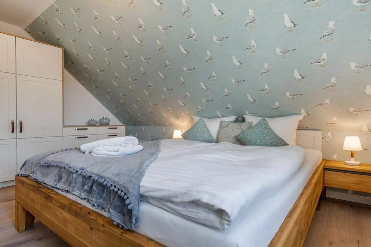 Das Schlafzimmer im unteren Bereich ist mit einem gemütlichen Boxspringbett mit den Maßen 180 cm x 200 cm und das Schlafzimmer im Dachgeschoss mit zwei Einzelbetten mit den Maßen 90 cm x 200 cm ausgestattet.