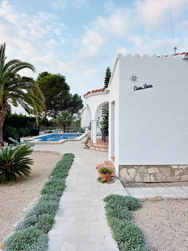 Im Außenbereich erwartet Sie unter der großen Palme eine Lounge-Sitzgruppe mit Polstern, diverse Sonnenliegen und Sonnenschirm rund um den Pool zur gänzlichen Entspannung. Auch eine Außendusche (kalt/warm) für die Erfrischung vor und nach dem Poolbesuch ist vorhanden. Im vorderen Bereich des Hauses liegt der Hauswirtschaftsraum mit einigen Pool-Accessoires sowie Waschmaschine, Wäscheständer und Reinigungsutensilien.