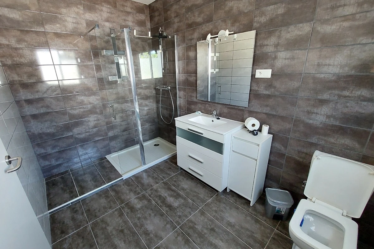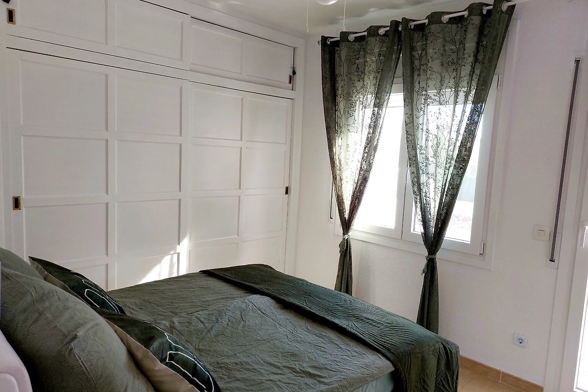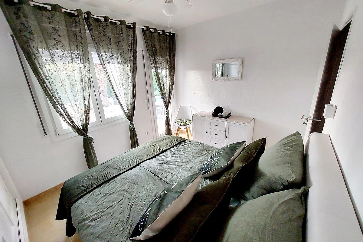Das erste Schlafzimmer ist ausgestattet mit einem Doppelbett (160x200cm) einer Kommode und einem großen Wandschrank. Es besteht auch die Möglichkeit ein Kinderbett (incl. Wickelauflage) aufzustellen. Von diesem Schlafzimmer gibt es durch eine Terrassentür die Möglichkeit auf die davorliegende Terrasse zu kommen ohne durchs Haus gehen zu müssen. Das zweite Schlafzimmer ist mit einem Doppelbett (150x190 cm) zwei Nachtischen, einer Kommode sowie einem etwas kleineren Wandschrank ausgestattet. Im dritten Schlafzimmer sind zwei Doppelstockbetten (für max. 4 Schläfer) und auch im großen Wandschrank findet sich genug Platz für alle Urlaubsutensilien. Alle Fenster sind mit Fliegengittern versehen und können mit Rollläden verschlossen werden.