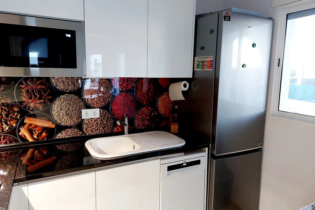 Über das großzügige Wohnzimmer mit zwei gemütlichen Sofas, einem großen Esstisch für 6-8 Personen gelangt man in eine halboffene Küche. Die neue Küche ist mit Spüle, Spülmaschine, Backofen, Ceranfeld (4 Platten), Mikrowelle, Abzugshaube und Kühlgefrierkombination ausgestattet. Weiterhin stehen Kaffeemaschine, Pad-Kaffeemaschine, Wasserkocher und Toaster zur Verfügung. Geschirr und Besteck, Pfannen und Töpfe sowie das dazugehörige Zubehör sind auch vorhanden.