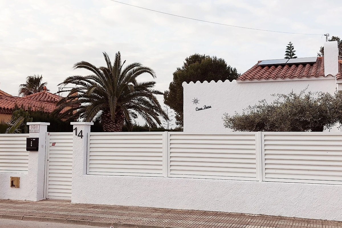 Unser Ferienhaus, 4-5 Minuten mit dem Auto vom Strand entfernt, zur Alleinnutzung, erreichen Sie durch eine Gartenpforte und durch eine Hofeinfahrt mit manuellem Schiebtor. Die Straßenansicht ist mit einem 170 cm hohen Zaun ziemlich Blickdicht eingefasst. Die Hofeinfahrt bietet die Gelegenheit zwei Fahrzeuge auf dem Grundstück zu parken.