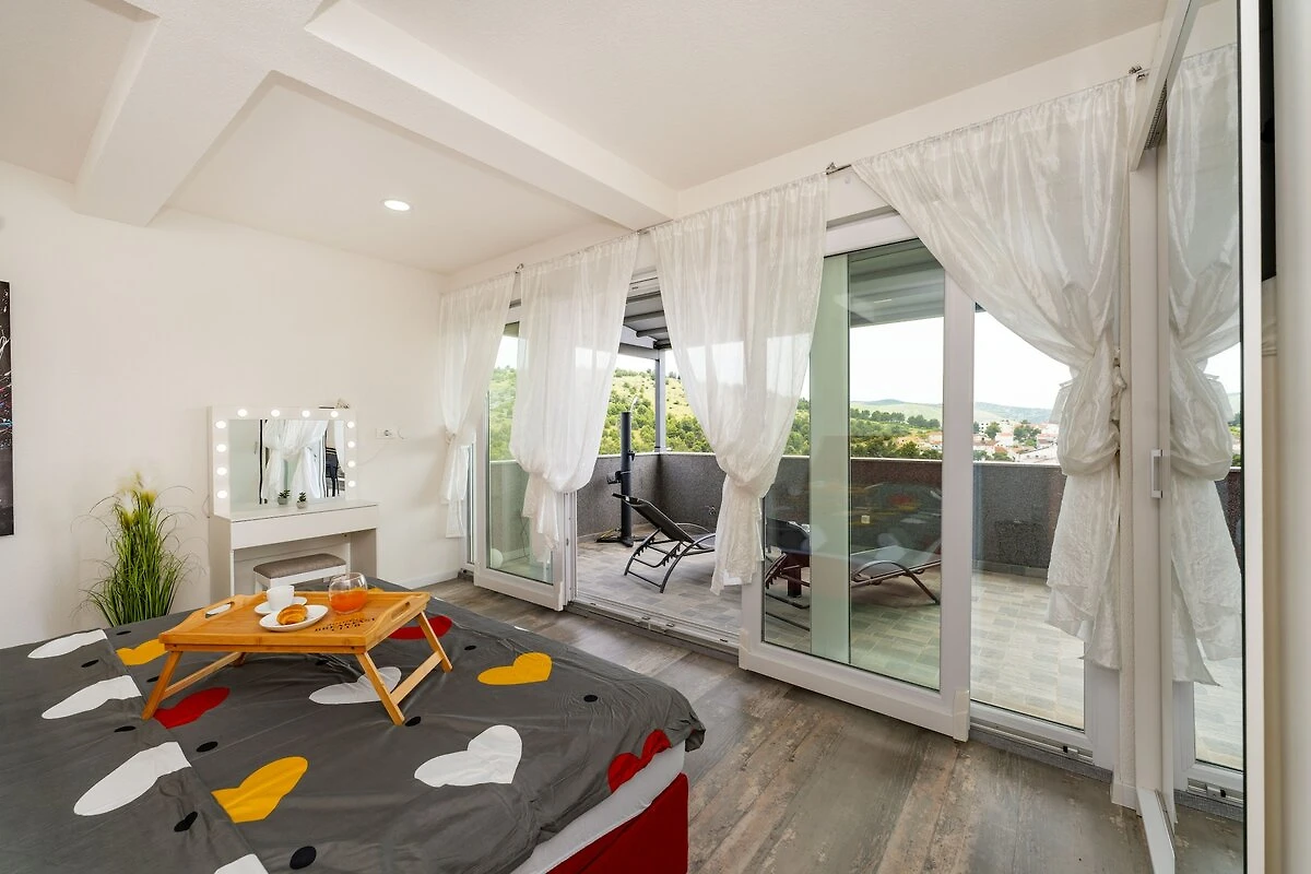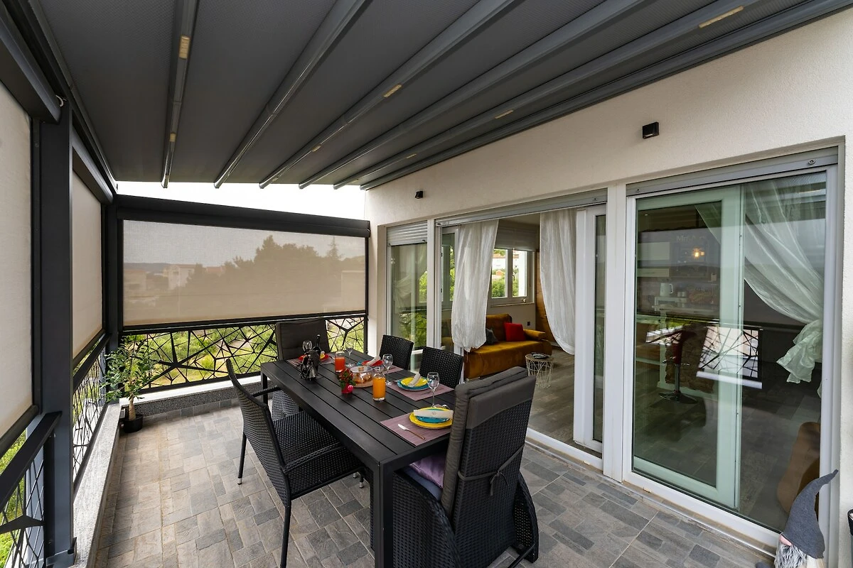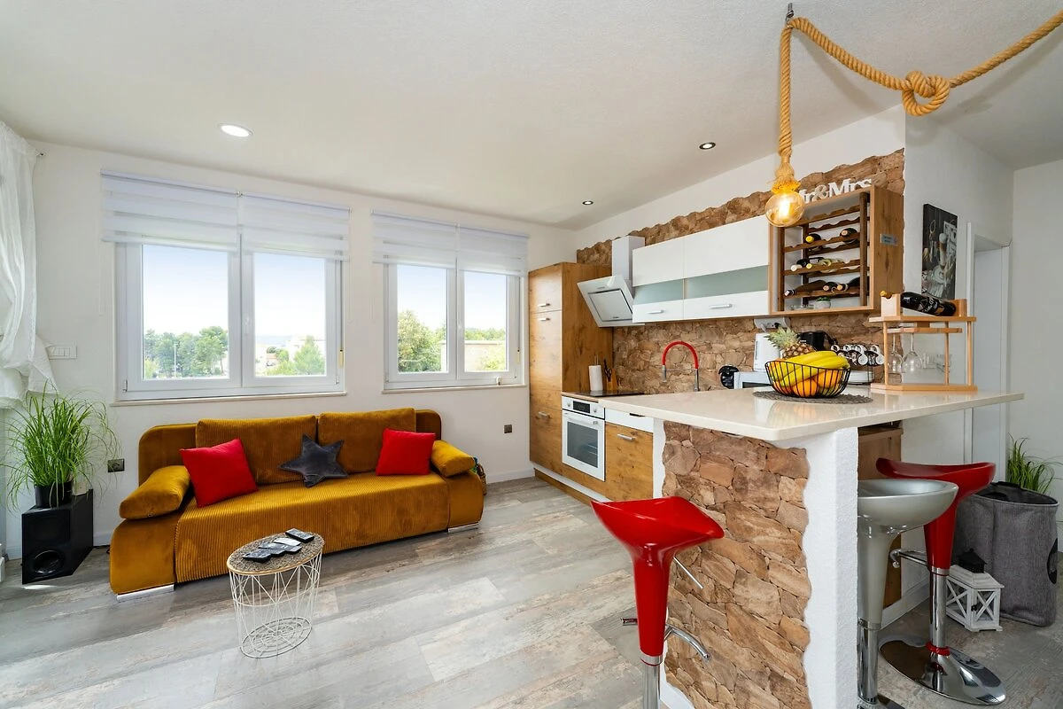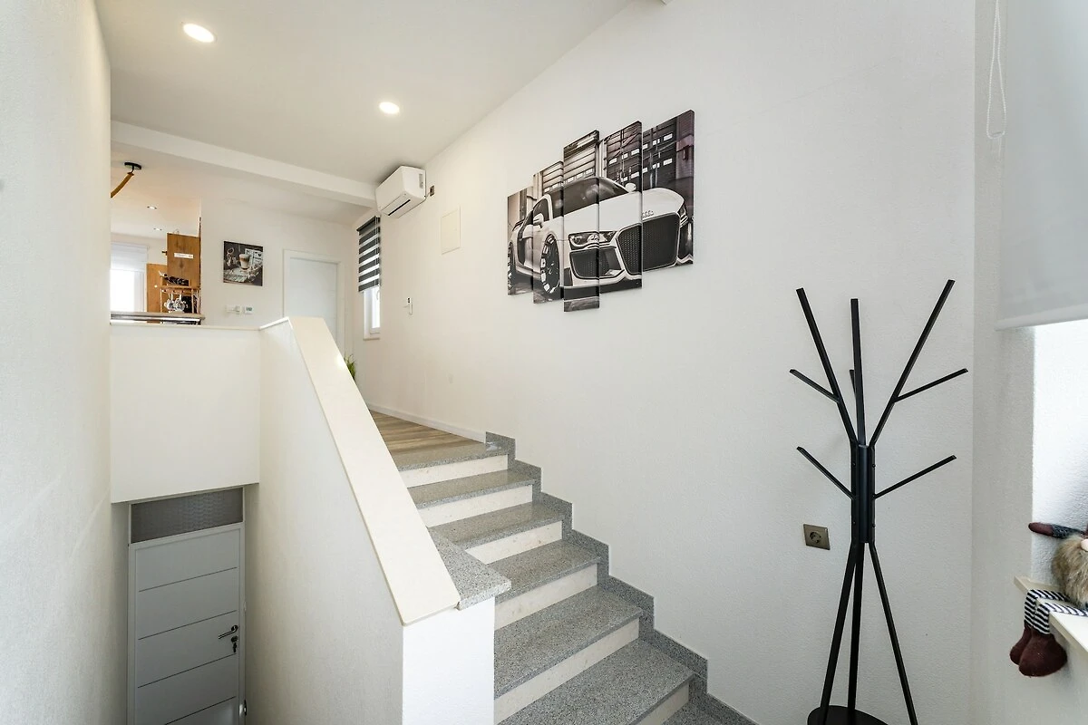 Das Apartment befindet sich im zweiten Stock und verfügt über ein komfortables Schlafzimmer, einen hellen offenen Wohn- und Essbereich und ein modernes Badezimmer mit Waschmaschine. Die voll ausgestattete Küche umfasst alle notwendigen Geräte wie Kühlschrank, Geschirrspüler, Backofen und Kaffeemaschine. Das Highlight der Unterkunft ist die geräumige private Terrasse mit herrlichem Panoramablick auf die Adria, ein perfekter Ort, um das Frühstück oder einen Drink am Abend zu genießen. Gäste können auch Gartenmöbel und Sonnenliegen nutzen, um sich vollkommen zu entspannen. Zwei private Parkplätze und schnelles WLAN sorgen für zusätzlichen Komfort.