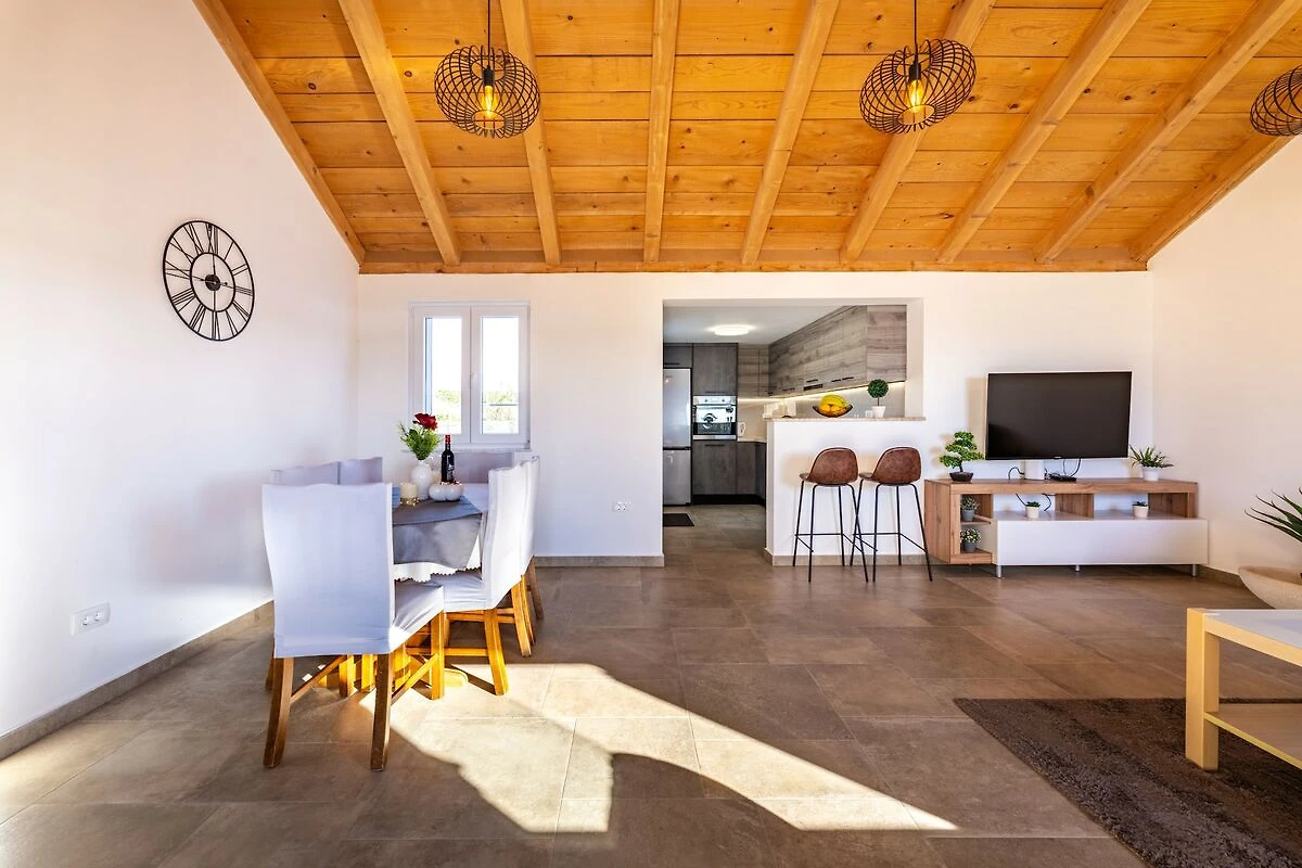 Genießen Sie einen ruhigen Urlaub am Meer in diesem modernen Ferienhaus im charmanten Küstendorf Rtina. Mit Panoramablick auf die Adria und die Berge bietet die Unterkunft eine entspannte Atmosphäre, nur 1 km vom Sandstrand entfernt. Es ist ideal für Familien oder Paare und verfügt über 2 geräumige Schlafzimmer mit Queensize-Betten und 2 moderne Badezimmer, in denen bis zu 4 Gäste bequem Platz finden.