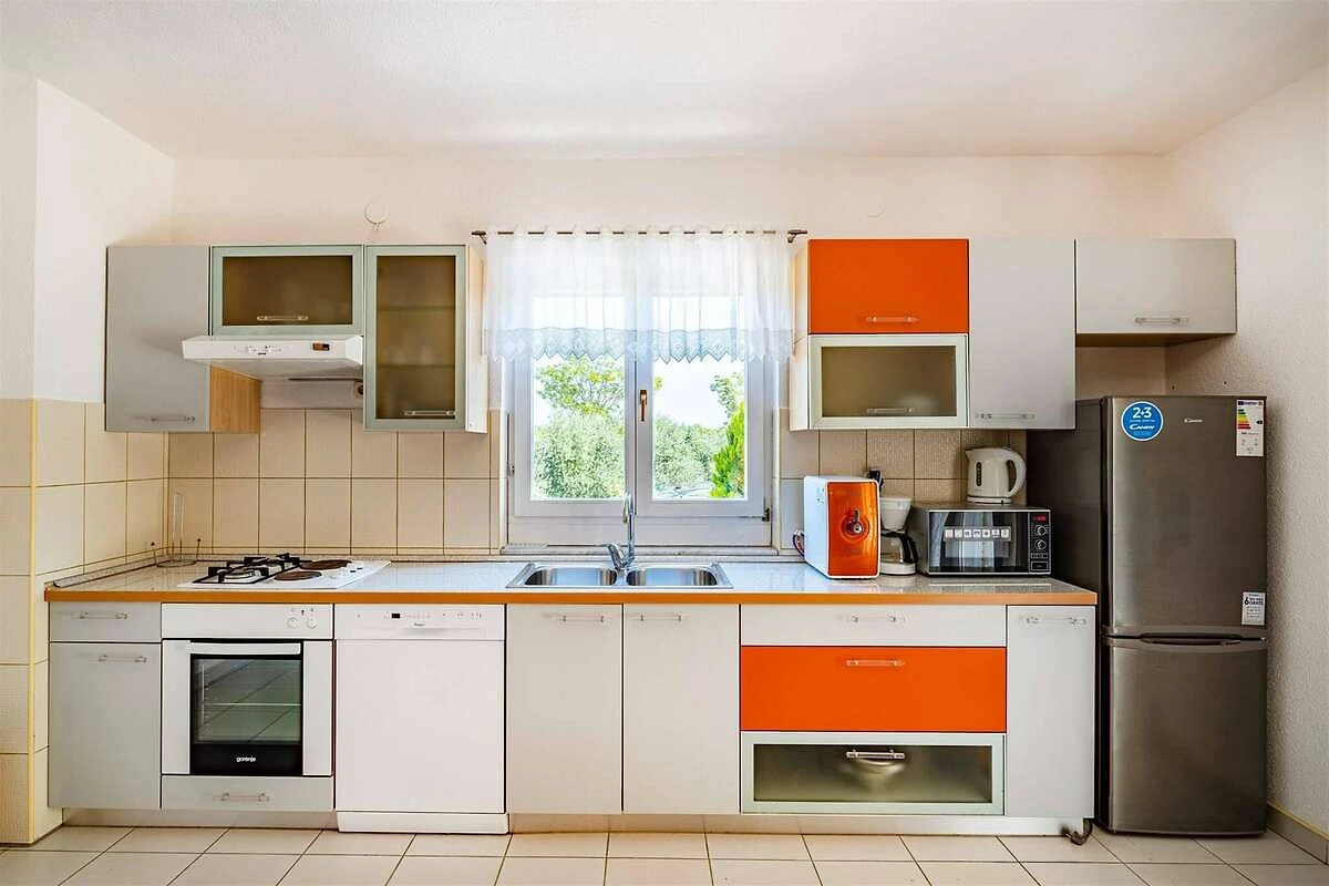 Im Außenbereich können die Gäste einen privaten 55 m² großen Infinity-Pool mit Sonnenliegen, eine Sommerküche, Grillmöglichkeiten und einen großzügigen Essbereich genießen. Außerdem gibt es einen Kinderspielplatz und einen multifunktionalen Sportplatz, die Unterhaltungsmöglichkeiten für alle Altersgruppen bieten. Naturliebhaber werden die Nähe zum Vrana-See zu schätzen wissen, der für Angeln und Vogelbeobachtung bekannt ist, während täglich Bootsausflüge zum Kornati-Nationalpark von Biograd aus starten. Mit Zadar und Šibenik, die beide weniger als 30 Autominuten entfernt liegen, bietet das Ferienhaus Blanka den perfekten Ausgangspunkt, um die Küste, Kultur und Landschaft Dalmatiens in vollen Zügen zu erkunden.