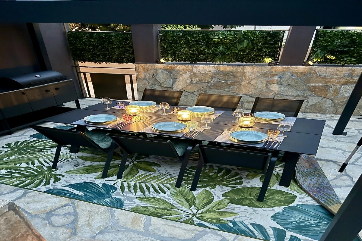 Das erste Haus bietet auf zwei Etagen viel Platz mit fünf klimatisierten Schlafzimmern, drei modernen Badezimmern, zwei voll ausgestatteten Küchen und einem großen Wohnbereich. Der Außenbereich umfasst einen privaten 55 m² großen Infinity-Pool mit Sonnenliegen, eine Sommerküche, Grillmöglichkeiten, einen Spielplatz und einen multifunktionalen Sportplatz, alles in einem wunderschön gepflegten Garten. Mehrere Terrassen bieten perfekte Plätze für Mahlzeiten im Freien und gesellige Zusammenkünfte unter der dalmatinischen Sonne.