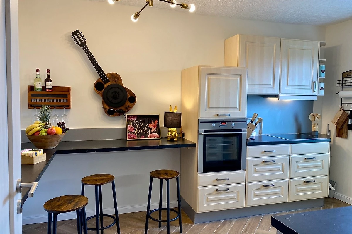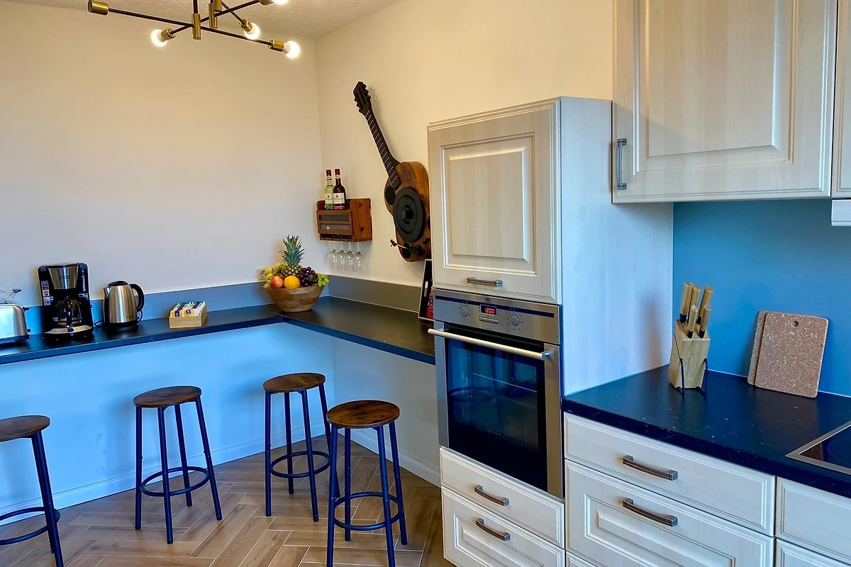 Die hochwertig ausgestattete Küche mit Backofen, Cerankochfeld, Spülmaschine, Kühlschrank, Kaffeemaschine, Toaster und vielem mehr lädt zum gemeinsamen Kochen ein. Im angrenzenden Esszimmer finden an einem grossen Tisch bis zu 6 Personen Platz – ideal für gesellige Runden.