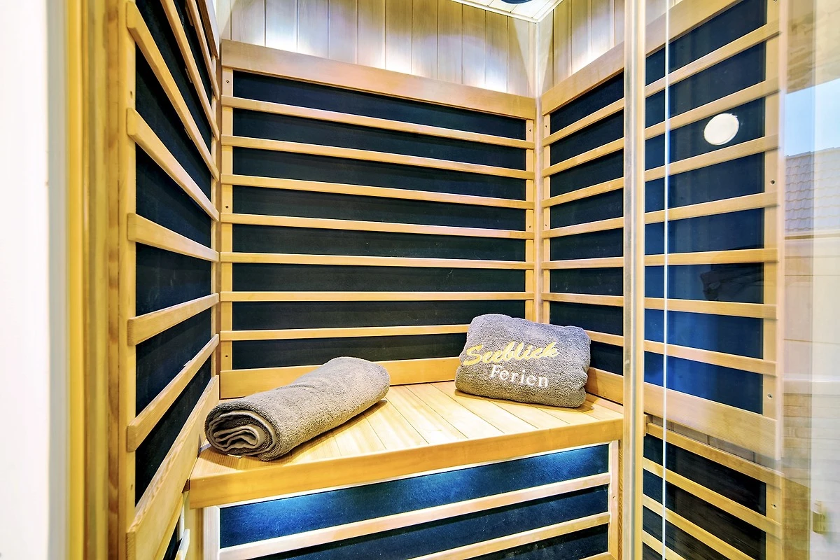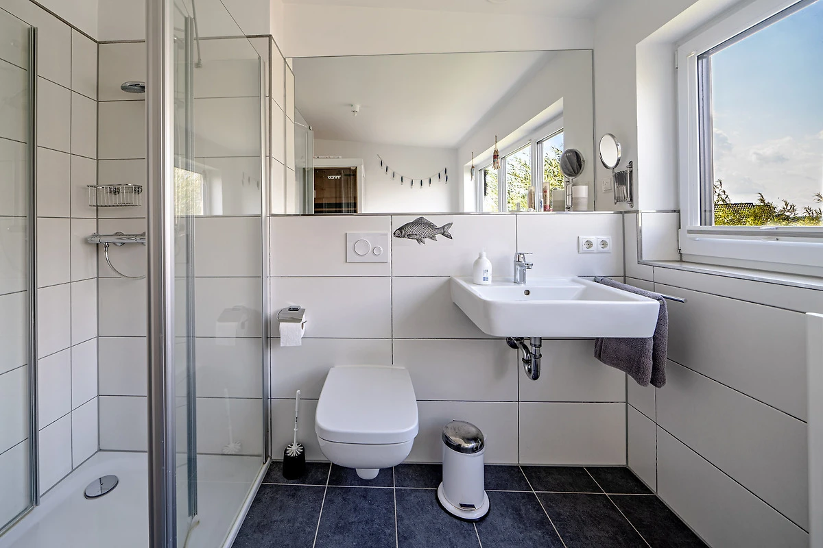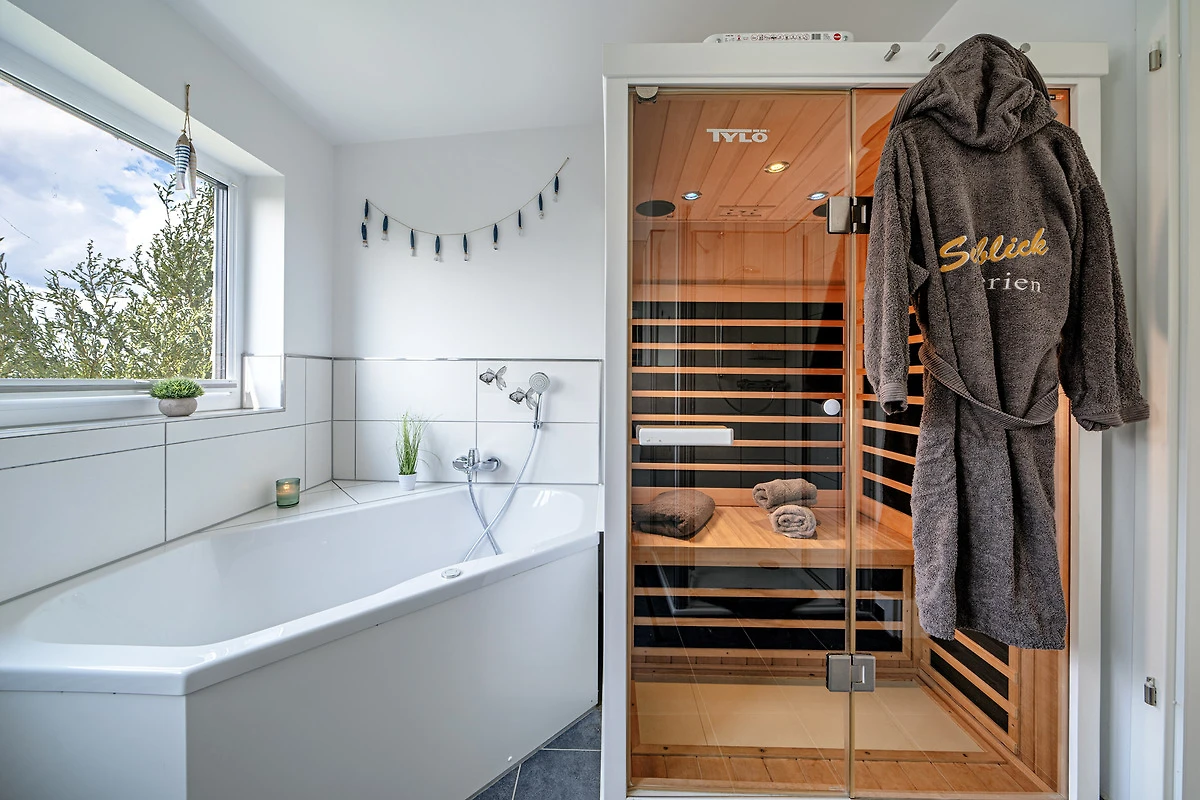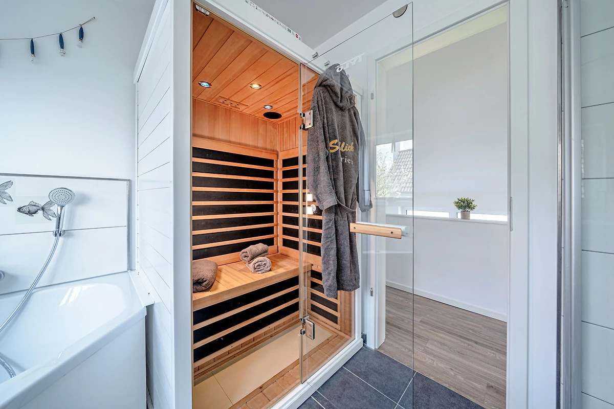 Das Ferienhaus bietet Ihnen den Luxus von zwei Badezimmern, jeweils auf einer Wohnebene. Entspannen Sie in der Infrarot-Sauna oder der grosszügigen Badewanne mit Whirlpoolfunktionen und geniessen Sie dabei den Blick auf das Wasser im ersten Obergeschoss.