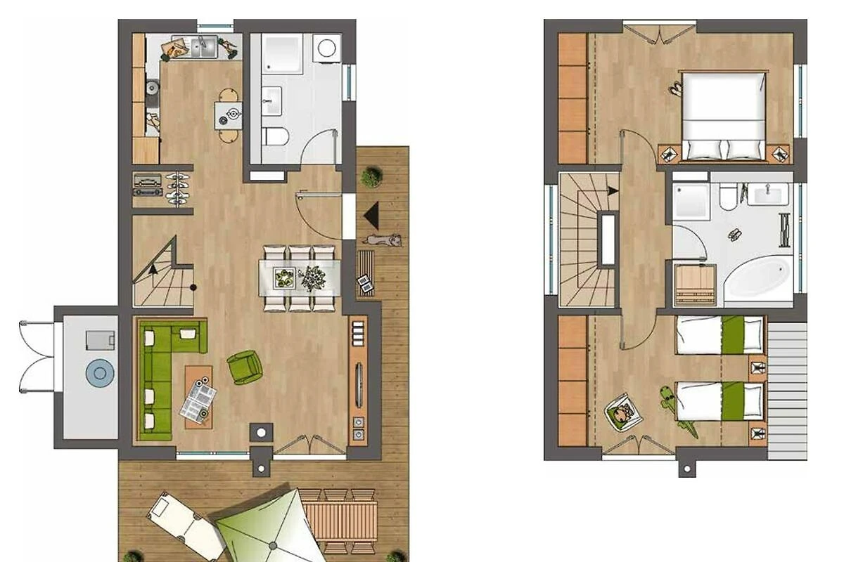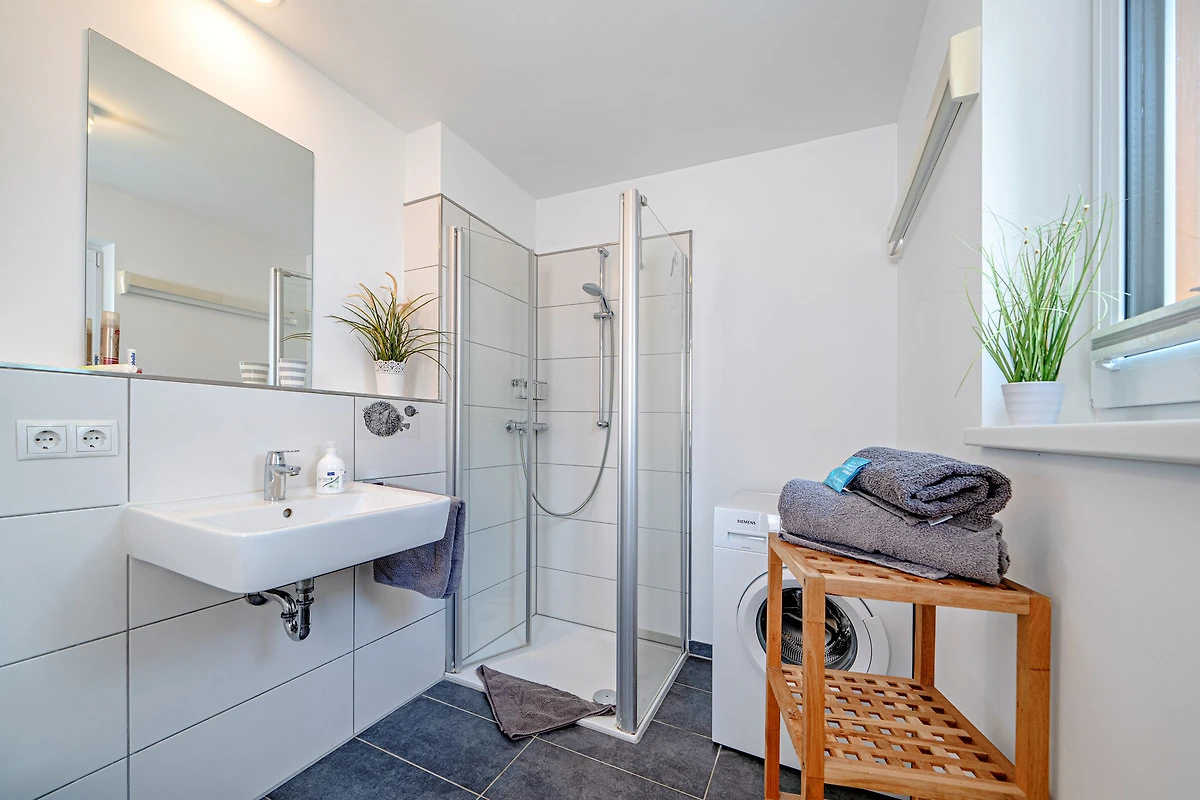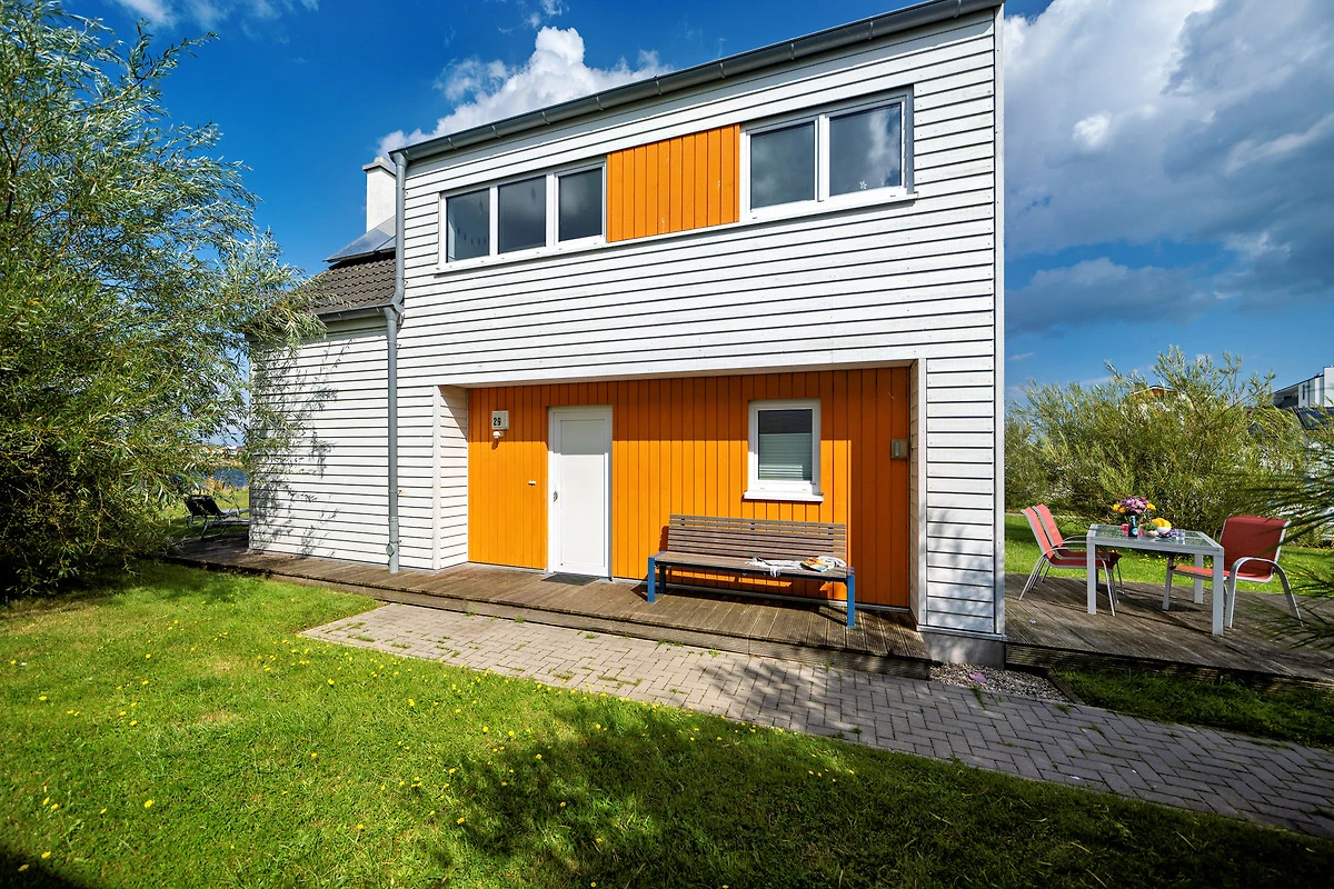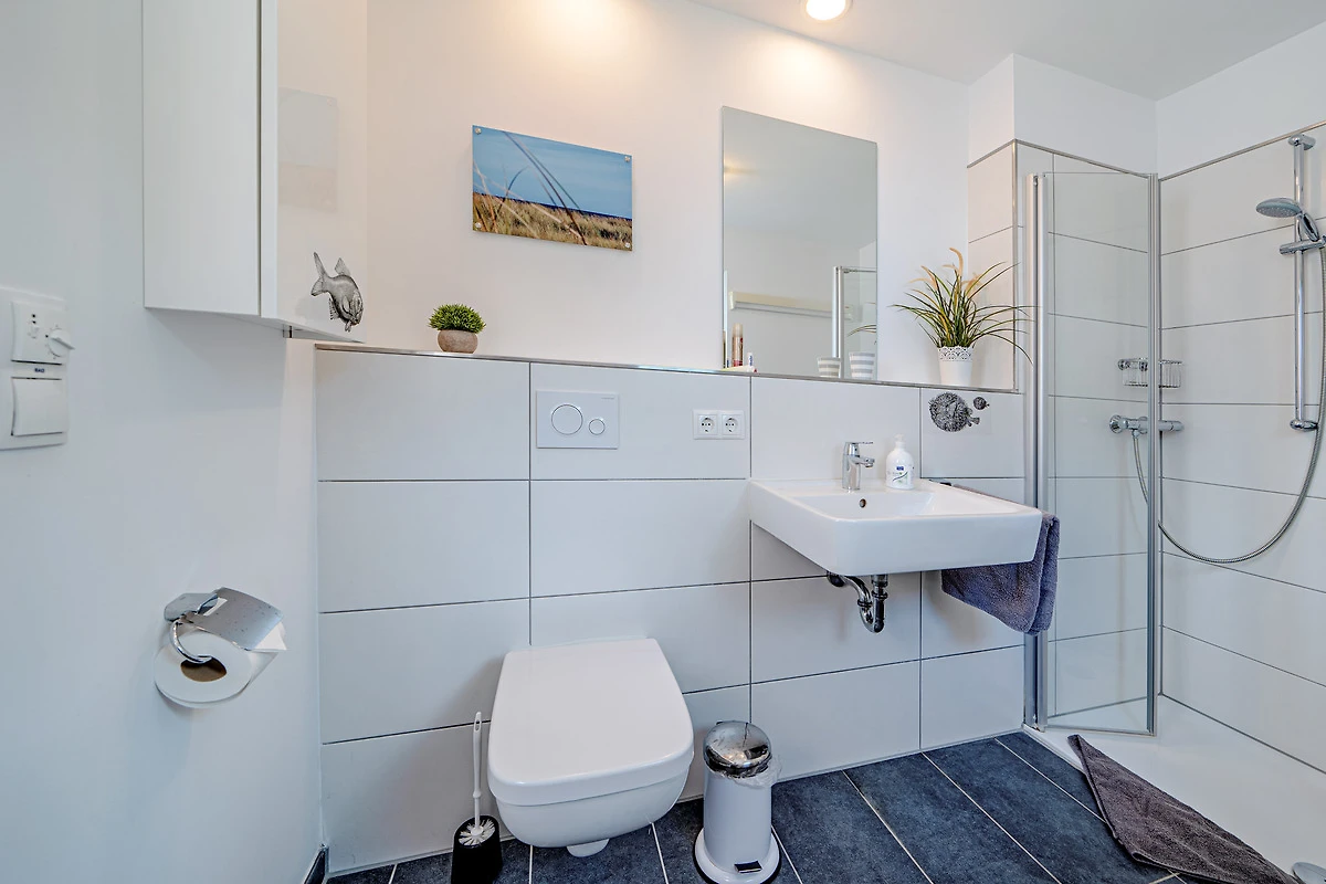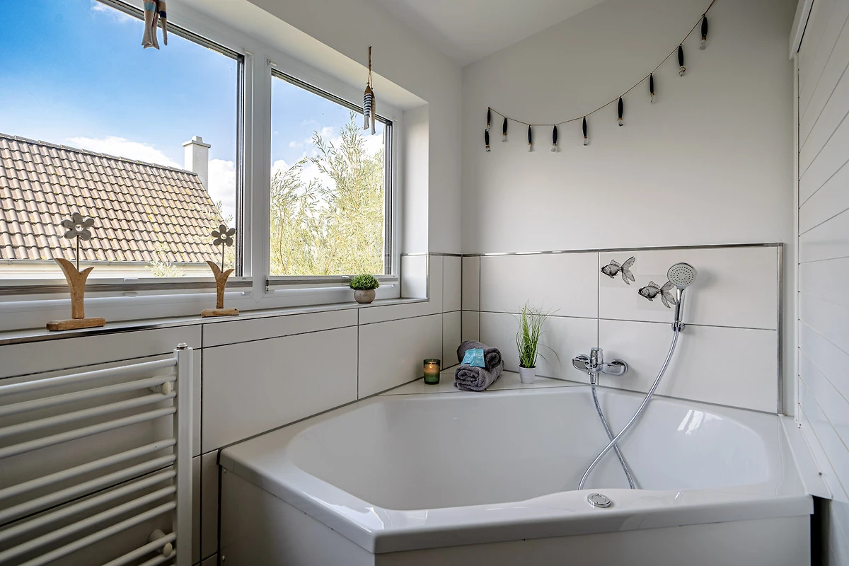 Das Ferienhaus bietet Ihnen den Luxus von zwei Badezimmern, jeweils auf einer Wohnebene. Entspannen Sie in der Infrarot-Sauna oder der grosszügigen Badewanne mit Whirlpoolfunktionen und geniessen Sie dabei den Blick auf das Wasser im ersten Obergeschoss.