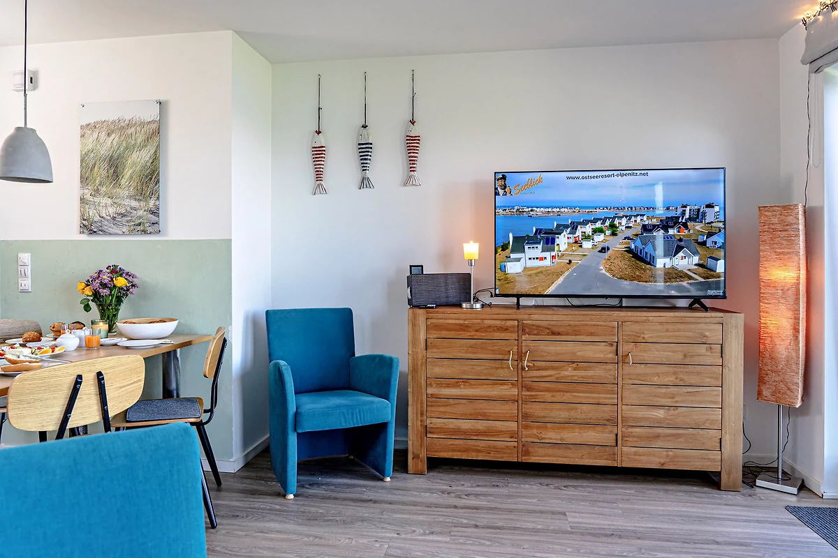 Der Einrichtungsstil des Hauses vereint moderne Eleganz mit maritimem Flair. Natürliche Materialien und harmonische Farbakzente schaffen eine einladende Atmosphäre.