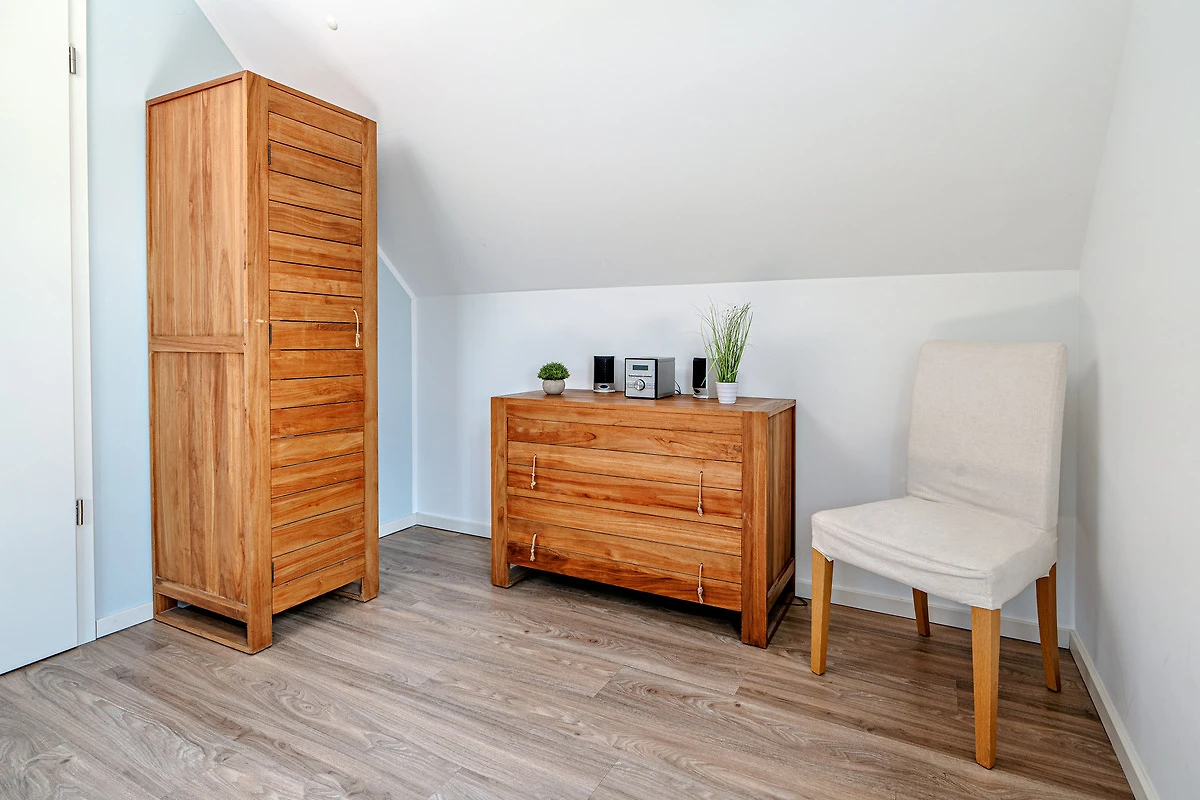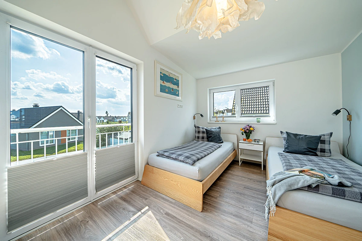Im ersten Obergeschoss erwartet Sie ein stilvoller Ruhebereich mit atemberaubendem Blick über das weite Meer. Das Hauptschlafzimmer mit Smart TV und einem komfortablen Boxspringbett und das zweite Schlafzimmer mit zwei Einzelbetten bieten erholsamen Schlaf. Ein Babybett steht ebenfalls bereit.