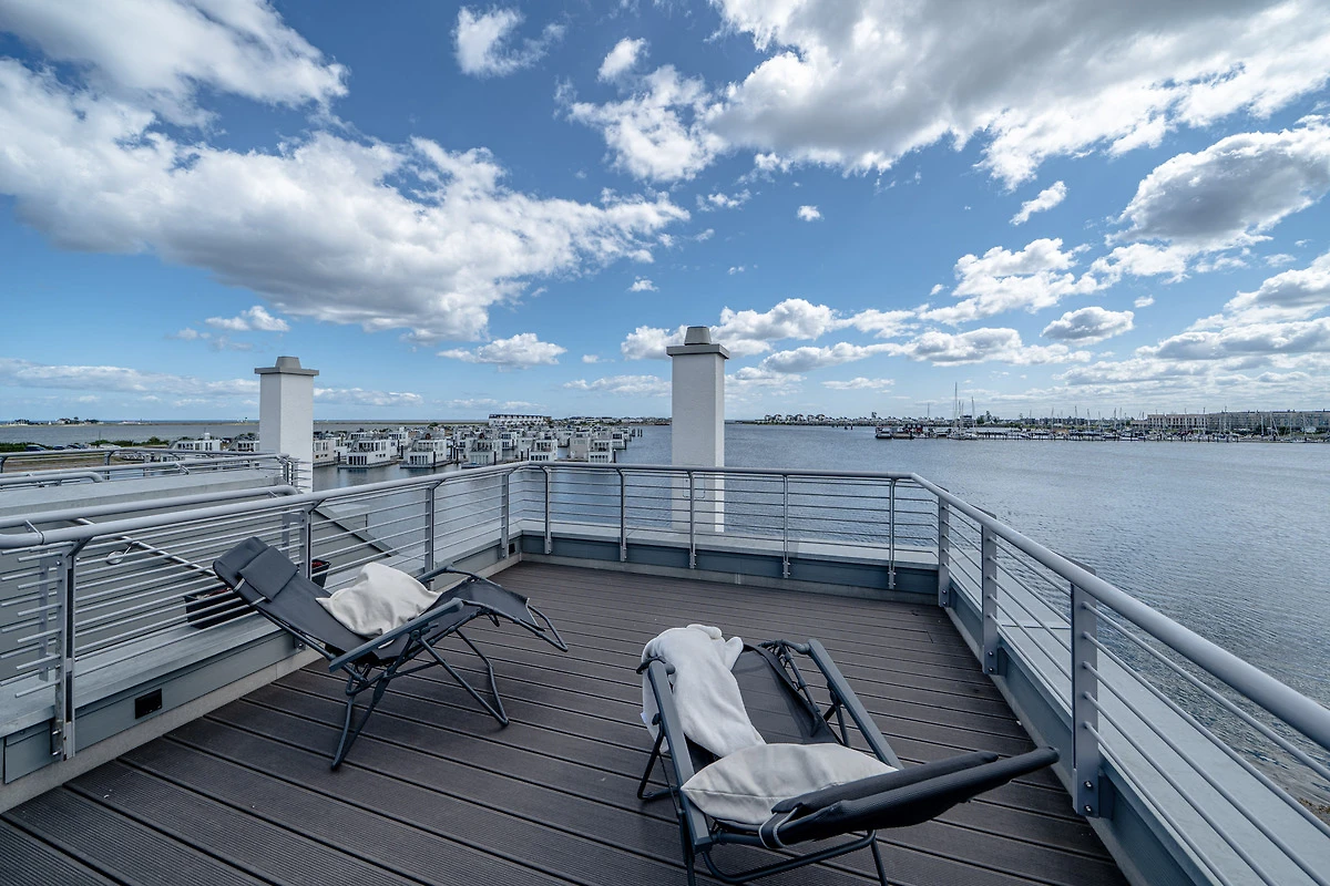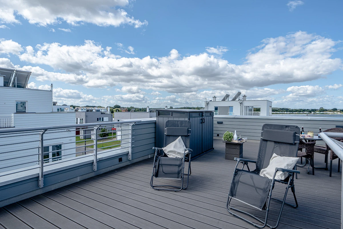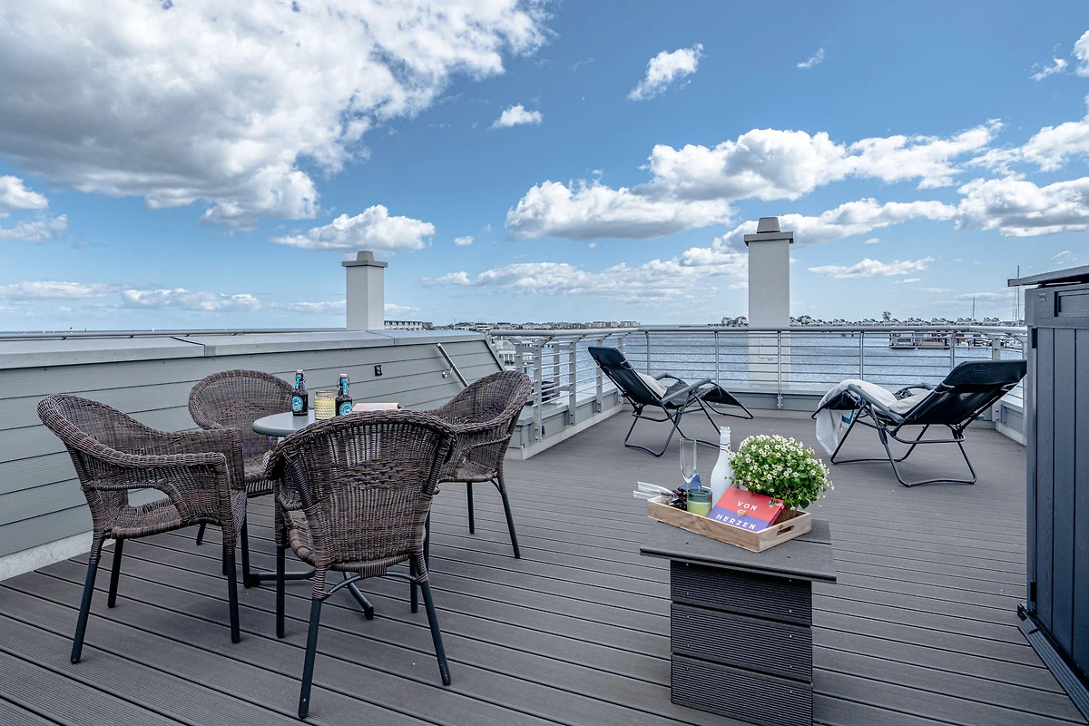Die Terrassen dieser traumhaften Unterkunft bieten ganztägig Sonne – von Sonnenaufgang bis Sonnenuntergang. Jede Etage verfügt über einen ansprechenden Aussenbereich, wobei das Highlight die 360°-Dachterrasse mit sensationellem Panoramablick ist. Von hier aus geniessen Sie die Aussicht auf die Marina, die Ostsee, die Schleimündung, den Ostseefjord Schlei und das umliegende Naturschutzgebiet.