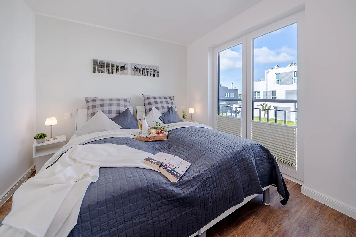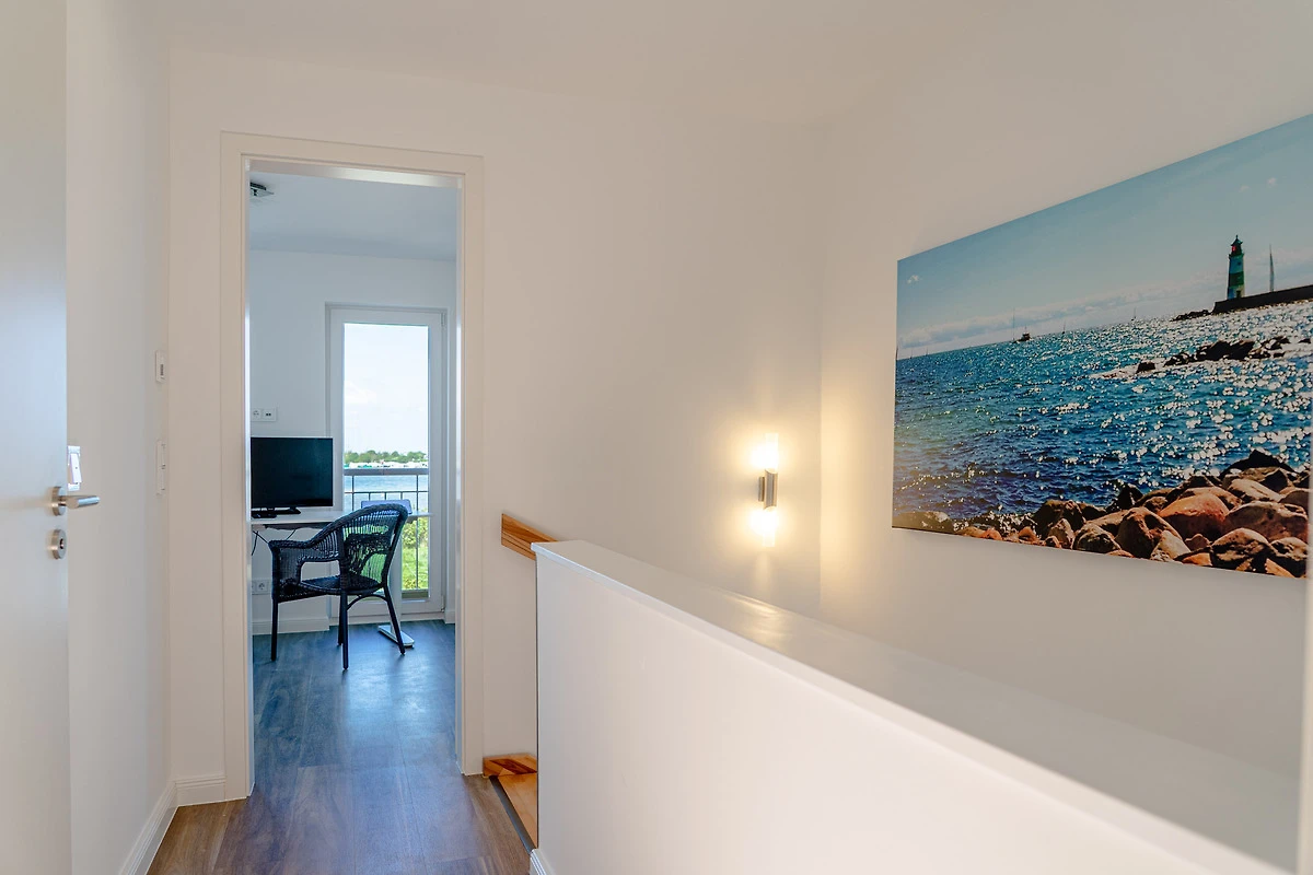Im ersten Obergeschoss befinden sich zwei Schlafzimmer mit Wasserblick. Das Hauptschlafzimmer, zum Hafen hin ausgerichtet, ist mit einem Doppelbett ausgestattet und bietet Zugang zu einem Balkon sowie zur grossen Dachterrasse. Das zweite Schlafzimmer bietet einen Blick auf den Ostseefjord Schlei und verfügt über zwei flexible Einzelbetten. Beide Schlafzimmer sind mit zusätzlichen Flatscreen-TVs und verdunkelbaren Plissees ausgestattet. Sollten Sie das Los gezogen haben im Urlaub arbeiten zu müssen, ist das auf keinen Fall eine Niete. In dieser Unterkunft befindet sich ein höhenverstellbarer Schreibtisch in einem der Schlafzimmer.