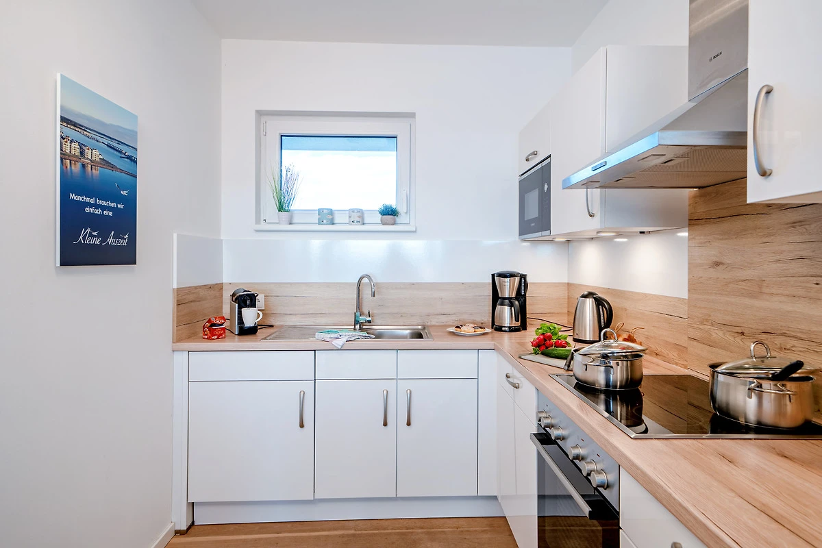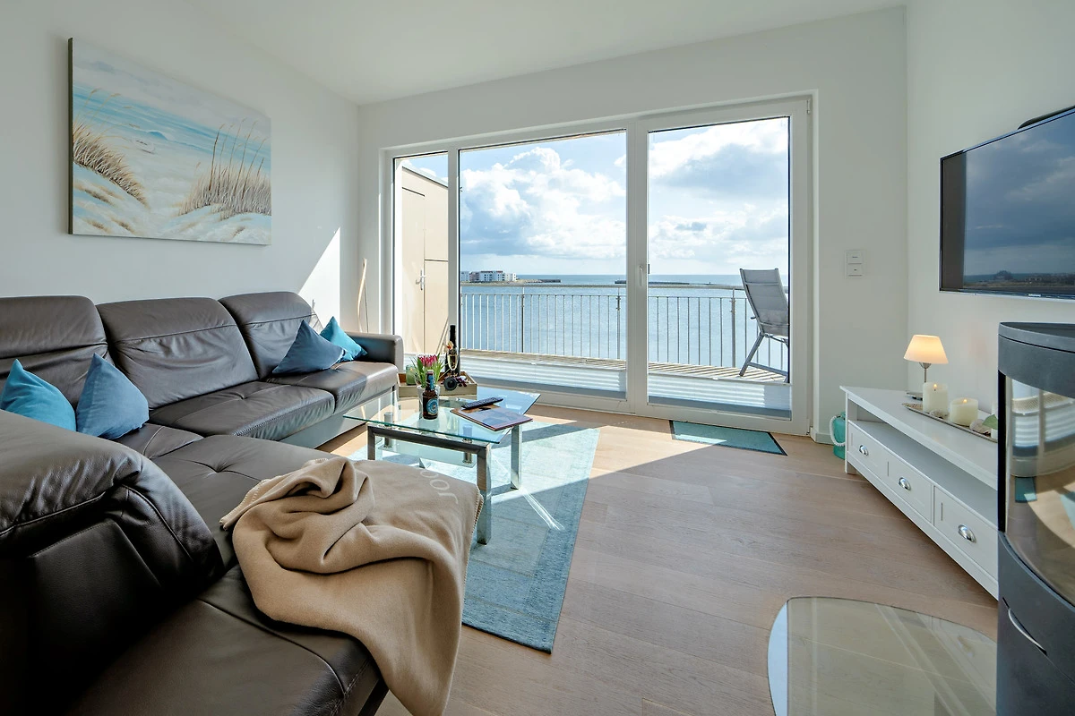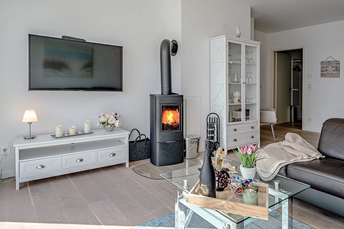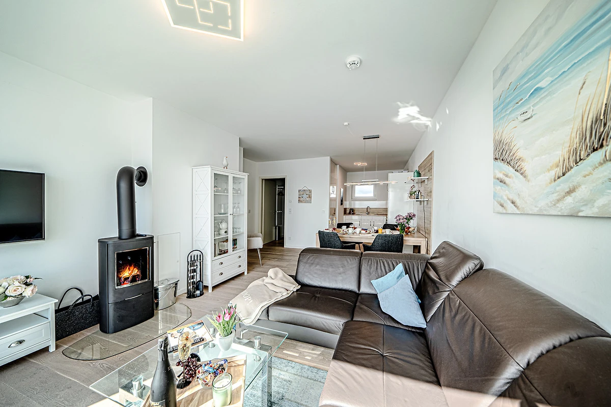Die elegante Wohnung ist im modernen maritimen Landhausstil gehalten und verspricht zu jeder Jahreszeit Gemütlichkeit und Wohlfühlatmosphäre. Der offene Wohn-Essbereich ist lichtdurchflutet durch grosse bodentiefe Fenster, die das helle Echtholzparkett perfekt zur Geltung bringen. An kühlen Tagen sorgt die Fussbodenheizung in allen Räumen für wohlige Wärme. Bei stürmischem Wetter können Sie es sich auf der allergikerfreundlichen, aus Textilleder bestehenden, gemütlichen Wohnlandschaft bequem machen und dem Wellentreiben an der Hafeneinfahrt zuschauen, während im Kamin ein gemütliches Feuer knistert.
