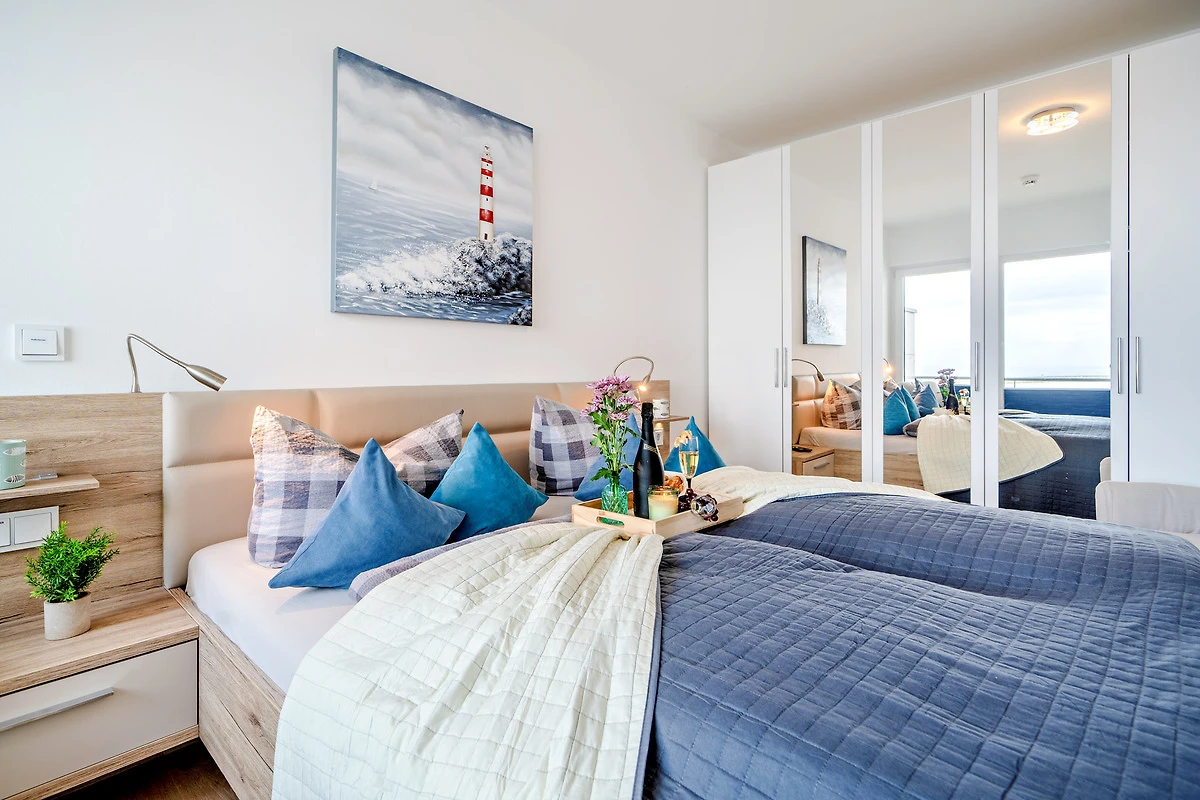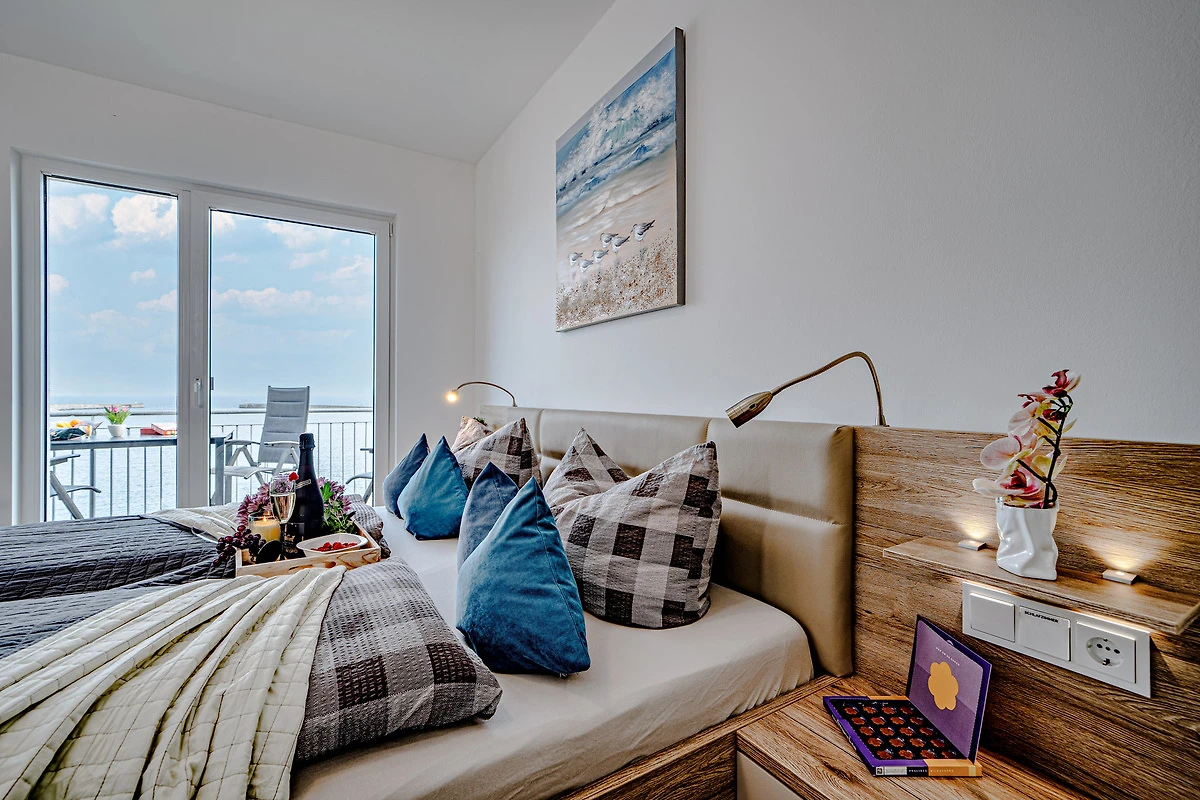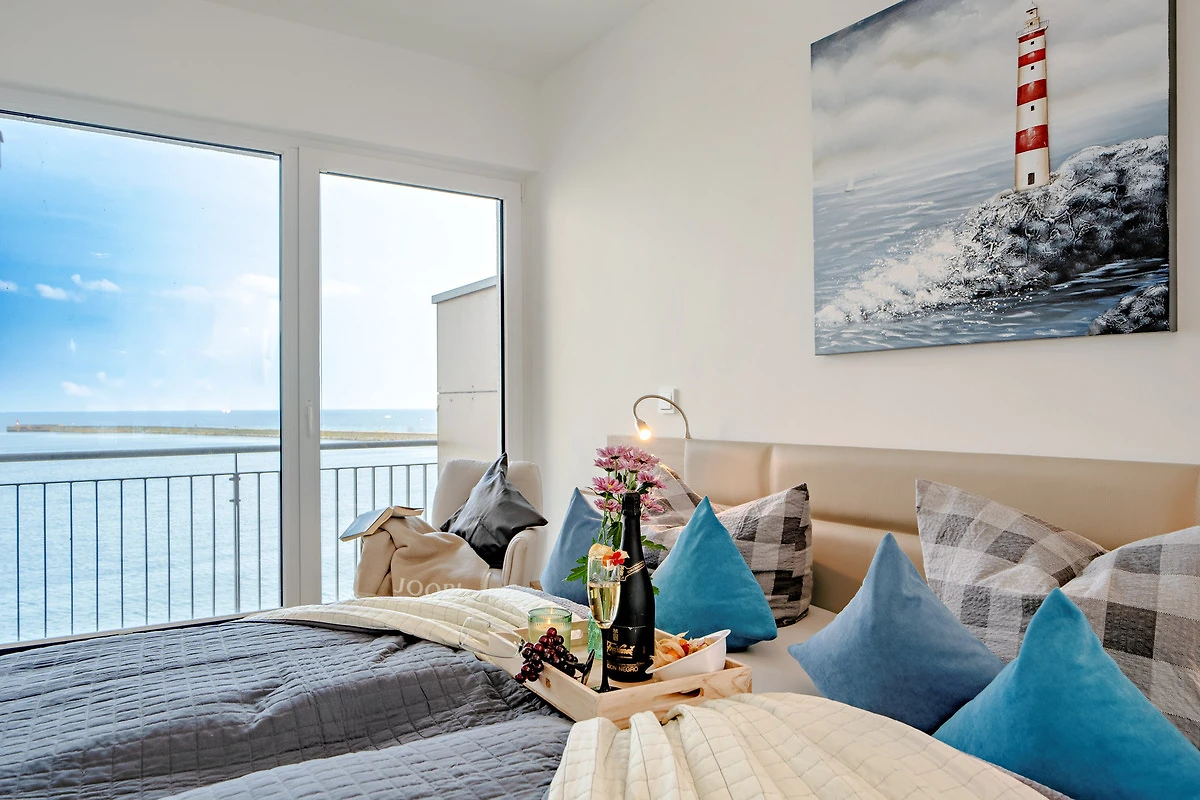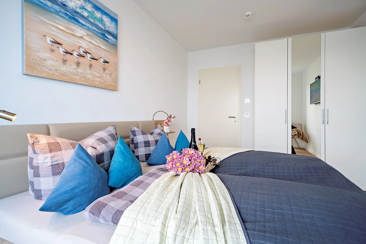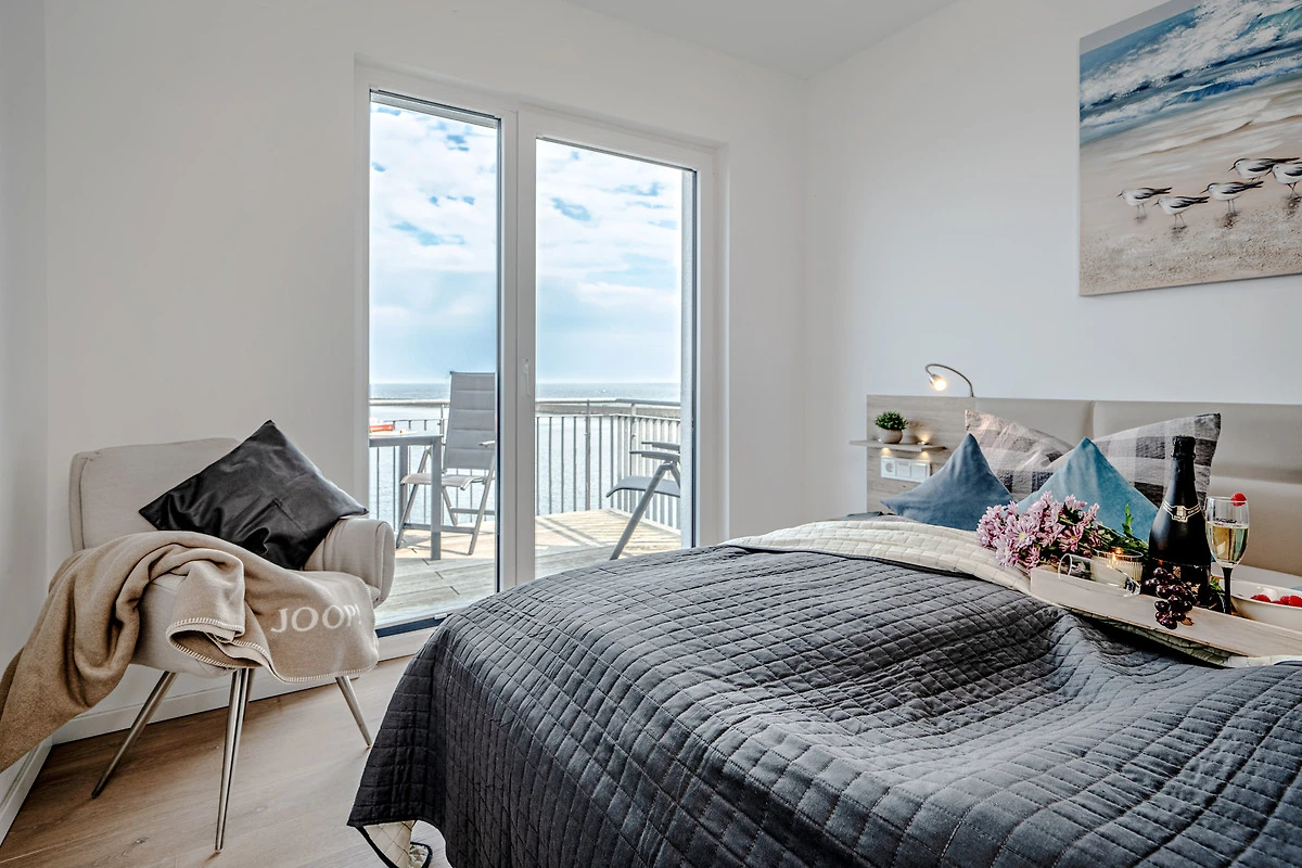 Beide Schlafzimmer bieten dank bodentiefer Fenster einen grandiosen Meerblick und haben direkten Zugang zu Balkonen. Das eine Schlafzimmer führt auf den Hauptbalkon, während das grössere Schlafzimmer einen eigenen separaten Balkon besitzt. Hochwertige Doppelbetten mit individuell verstellbaren Lattenrosten garantieren erholsamen Schlafkomfort.