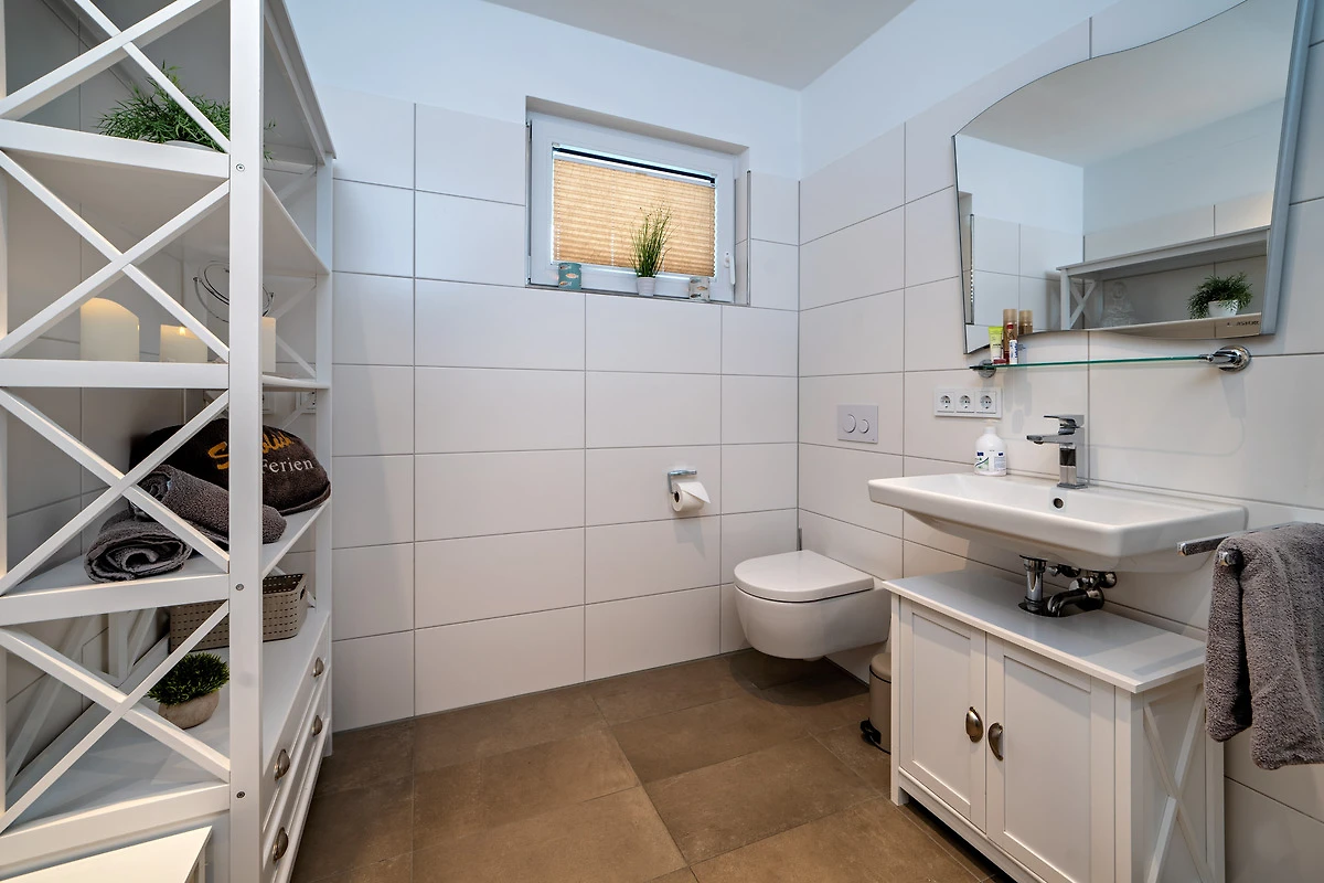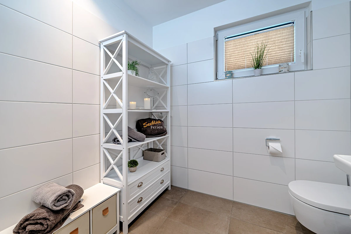 Das grosszügige Badezimmer mit einer bodengleichen, grossen Dusche ist ein weiteres Highlight der Kleinen Auszeit by Seeblick Ferien ORO und macht das Duschen zum Vergnügen. Für beste Unterhaltung sorgen smarte Fernseher mit Magenta TV im Wohnzimmer 49 Zoll und in beiden Schlafzimmern 43 Zoll sowie eine Spielesammlung.