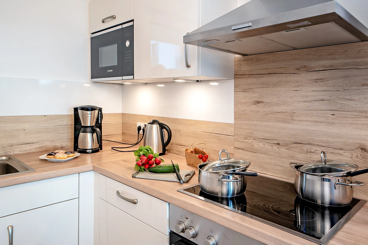 Die moderne, voll ausgestattete Küche lässt keine Wünsche offen und der angrenzende Essbereich bietet viel Platz für kulinarische Erlebnisse. Der grosse Balkon, der direkt ans Wasser grenzt, lädt ebenfalls zum Essen und Verweilen ein, natürlich sind auch Liegestühle vorhanden.