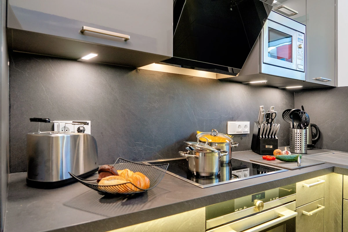 Die komplett ausgestattete Design-Küche begeistert Hobbyköche mit einer Vielzahl von Annehmlichkeiten. Ein Geschirrspüler, Induktionskochfeld, Backofen, Mikrowelle, Kühlschrank mit Gefrierfach und ein Thermomix komplettiert das Ensemble und lässt die Herzen von Kochenthusiasten höher schlagen. Als besonderes Highlight steht ein Kaffeevollautomat ohne Milchsystem bereit – ideal für Kaffeeliebhaber, die den reinen Geschmack schätzen. Erleben Sie pure Entspannung in Ihrem Urlaubsdomizil.
