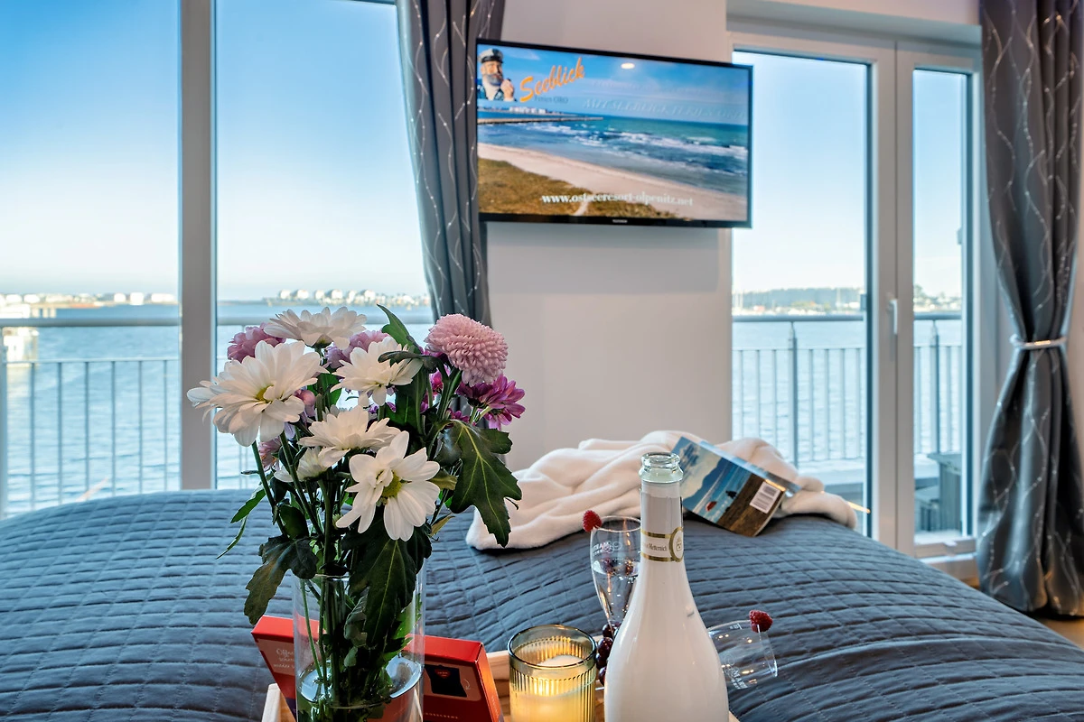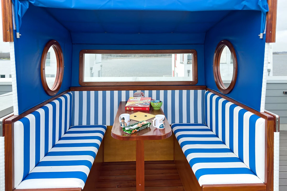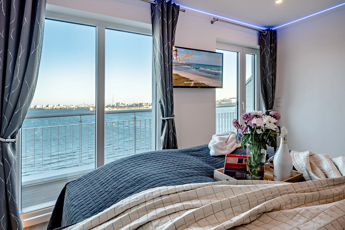 Die Interieur kombiniert modernen Stil mit erstklassigem Komfort. Der Masterbedroom beeindruckt mit einem luxuriösem Wasserbett (1,80m x 2,20m) und bietet einen atemberaubenden Ausblick auf die Marina. Gleichzeitig enthüllt das zweite Schlafzimmer mit einem Boxspringbett (1,80m x 2m) die Schönheit der Schlei.