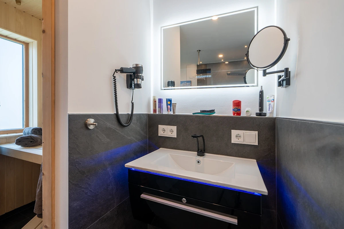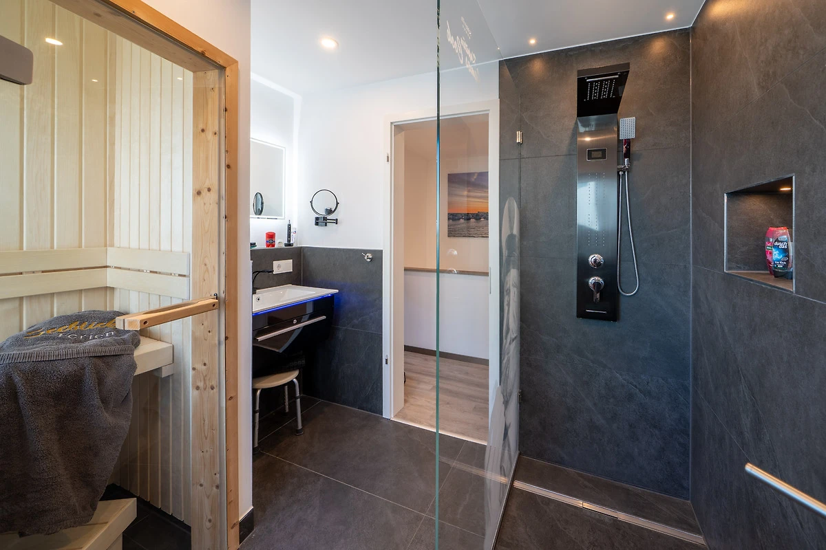 Die Ausstattung dieses exklusiven Domizils lässt keine Wünsche offen. Ein modernes Bad mit WC, Dusche und einer Sauna verspricht Entspannung pur in der ersten Etage. Die finnische Sauna aus Espenholz bringt unvergleichliche Wärme und ein nachhaltiges Saunaerlebnis auf höchstem Niveau und ist dank Ihrer Hypoallergenität ideal für Allergiker.