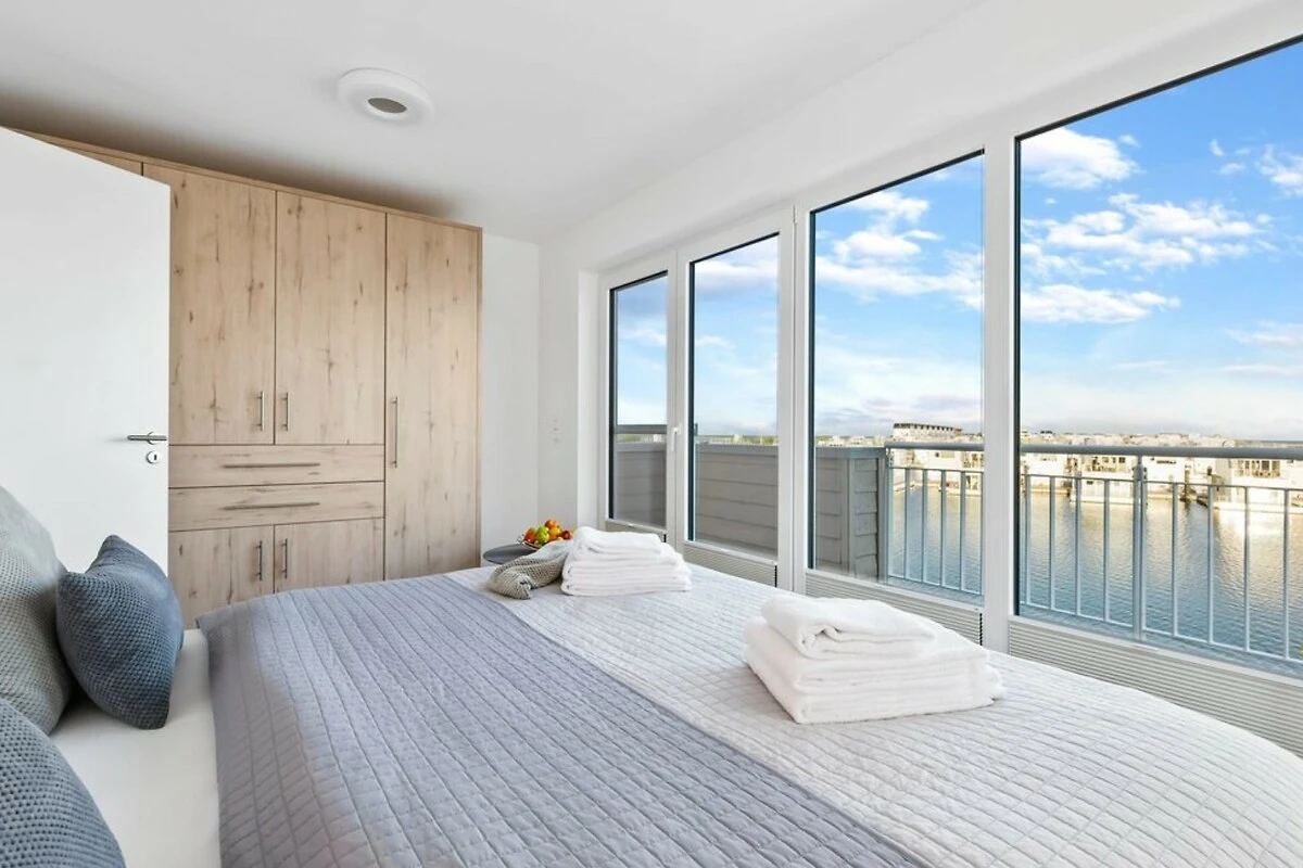 Eine Etage höher liegt das dritte Schlafzimmer, welches mit einem bequemen Schlafsofa und einem weiteren TV ausgestattet ist. Ein wunderbarer Ausblick auf den Hafen lässt einen mehr als entspannt entschlummern und auch arbeiten, denn es steht zudem ein Schreibtisch zur Verfügung.