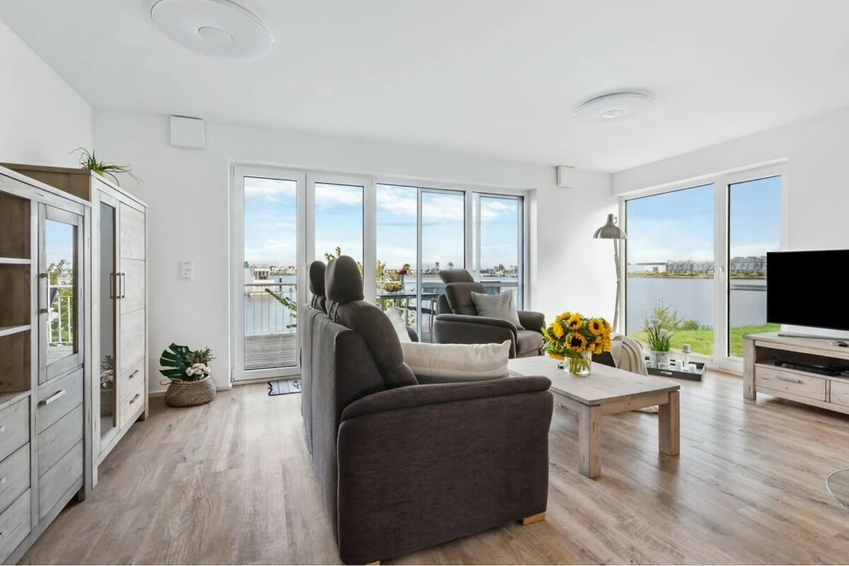 Der grosszügige Wohn- und Essbereich mit seinem hochwertigen und modernen Mobiliar versprüht Urlaubsfeeling von der ersten Sekunde an. Wenn dann dazu der Blick durch die bodentiefen Fenster über die Terrasse auf die Marina des Ostseeresorts Olpenitz fällt, ist der Alltag ganz schnell vergessen.