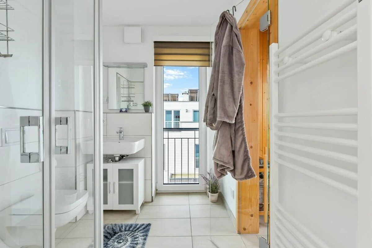 Im zweiten Obergeschoss wartet das Masterbedroom – ein Ort der Ruhe mit eigenem Fernseher, einem angrenzenden Office-Bereich für konzentrierte Arbeitsstunden und einem modernen Duschbad mit bodengleicher Dusche. Das besondere Highlight dieser Etage: eine grosse finnische Sauna, die Ihnen nach einem Tag am Strand oder einem langen Spaziergang entlang der Schlei wohltuende Entspannung schenkt.