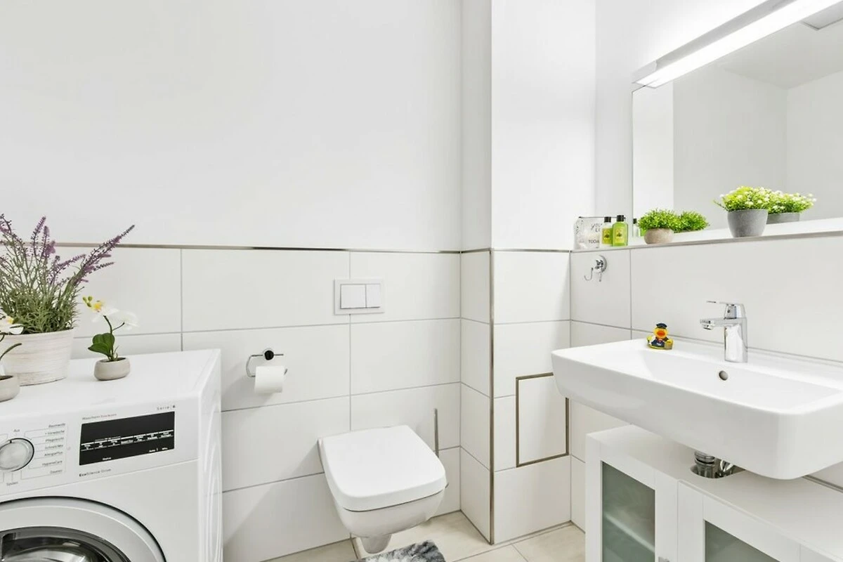 Im Erdgeschoss befindet sich zudem ein praktisches Gäste-WC mit eigener Waschmaschine, sodass auch längere Aufenthalte komfortabel und unkompliziert sind.