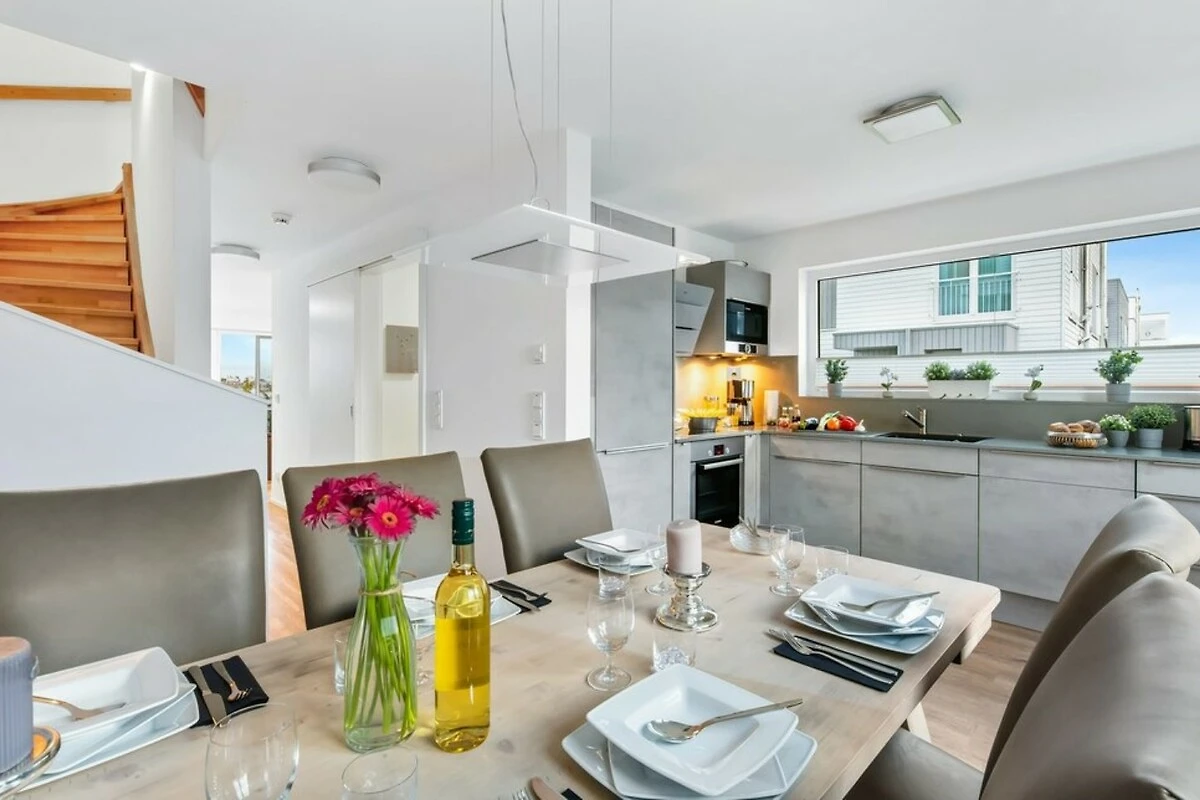 Die moderne Einbauküche ist ein Highlight für Hobbyköche. Ob frischer Fisch vom Hafen oder ein entspanntes Frühstück mit Blick aufs Wasser – hier wird Kochen zum Erlebnis. Im Anschluss lädt die grosse Terrasse mit bequemen Gartenmöbeln zu geselligen Grillabenden auf dem Weber Elektrogrill oder entspannten Lesestunden ein.