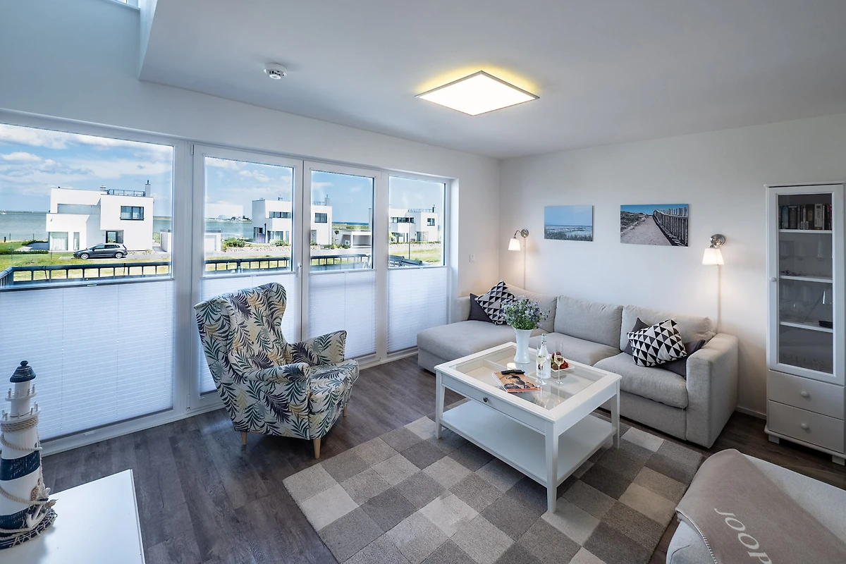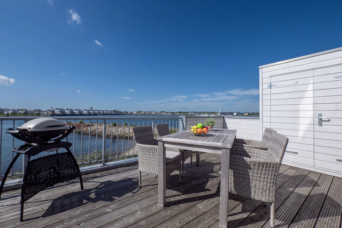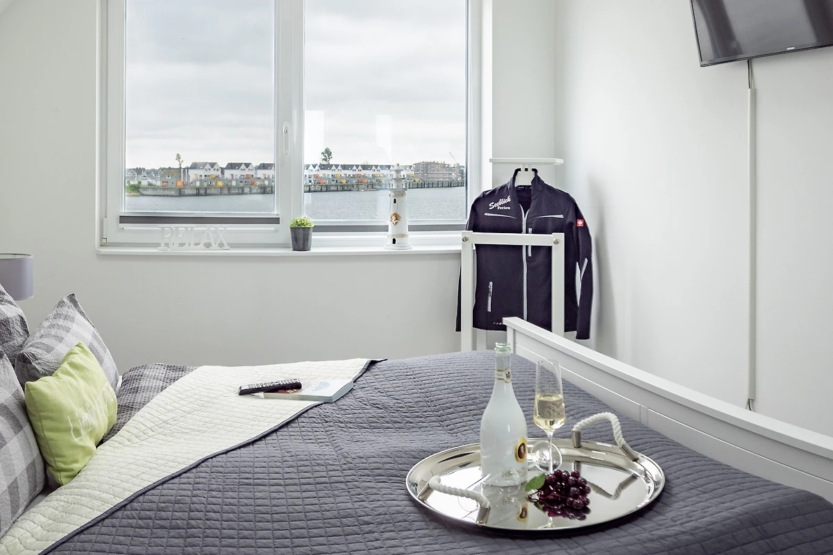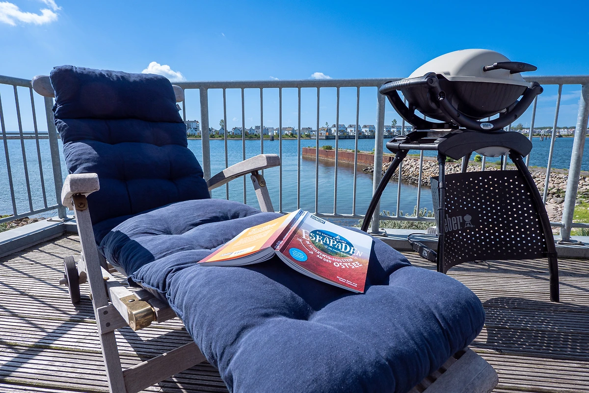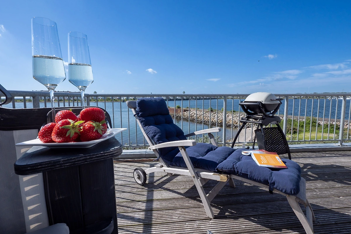 Im Fokus steht aber der perfekt umgesetzte lichtdurchflutete Wohn- und Essbereich mit Holz befeuertem Kaminofen, bodentiefen Panoramafenstern, welcher Loftartig gestaltet ist, sodass alle Räume fliessend ineinander übergehen und sich der Wohnbereich mit der Natur verbindet. Die Integration der offenen Küche mit hervorragender Ausstattung und funktionalem Design, steht dem gemütlichen Beisammensein auch beim Zubereiten von allerlei Köstlichkeiten nichts im Wege. Die Wasserkulisse vor dem Essbereich mit 180 Grad Panoramablick auf den gesamten Hafen und die Ostsee ist hierbei zum Greifen nah – das ist Ostseeflair. Den zweiten Nordbalkon (ca. 8m²) betritt man über den Wohnbereich, hier können es sich unsere Gäste auf einer zusätzlichen Bestuhlung gemütlich machen und bei einem Sundowner mit Abendsonne den Tag ausklingen lassen.