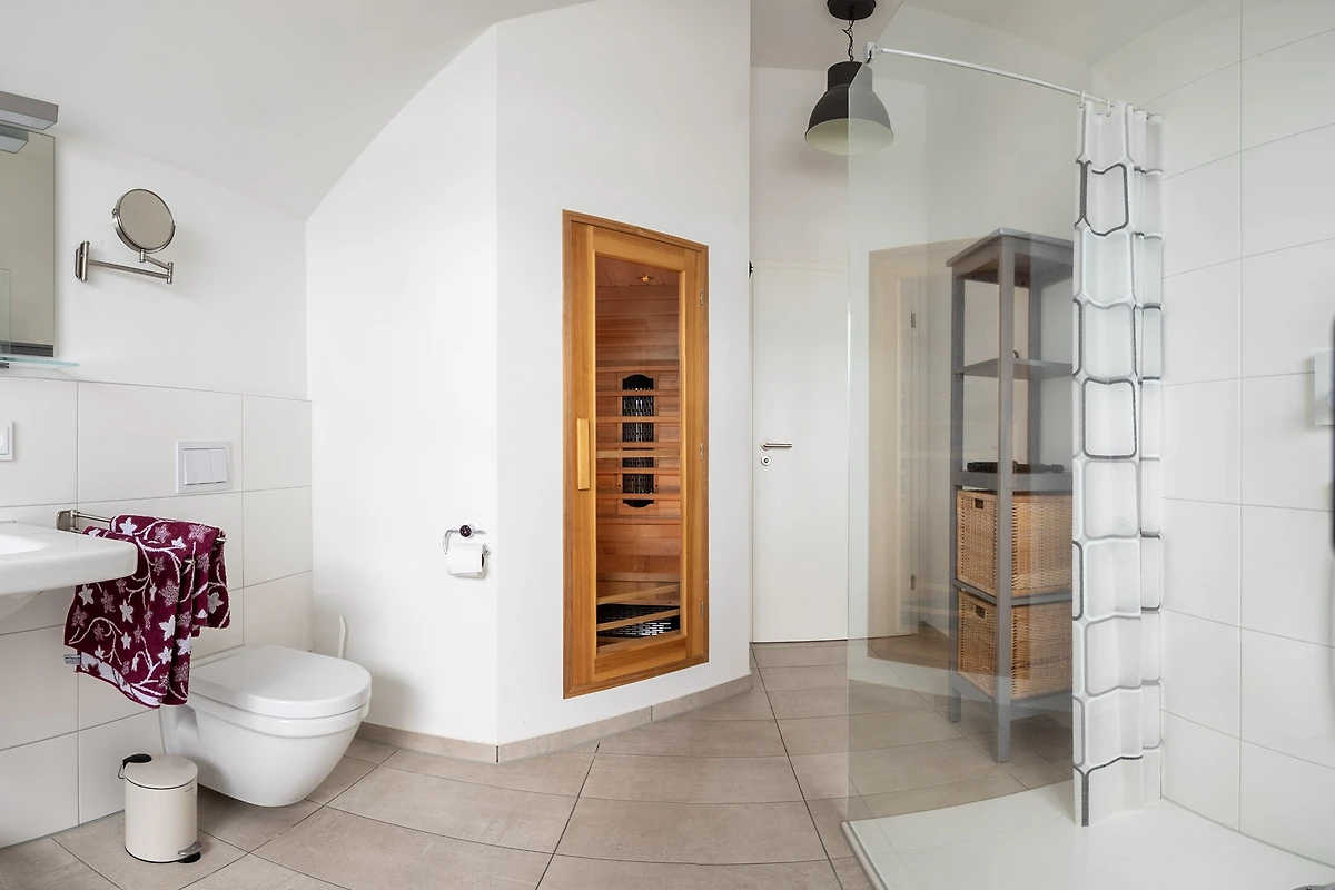 Die Ferienwohnung Ostseeflair by Seeblick Ferien ORO betritt man über eine Aussentreppe, von hier könnte man sofort auf den ersten Südbalkon (ca.25 m²) gelangen, der mit einem Strandkorb, Teak-Deckchair und weiteren gemütlichen Möbeln zum Relaxen auf Sie wartet. Der Eingangsbereich führt in den Wohn-und Essbereich mit zusätzlichem Duschbad und WC. Auf der zweiten Ebene befindet sich Ihr Badezimmer, dies lässt Wellnessherzen höherschlagen, denn es verfügt über eine bodengleiche XXL Walk-In-Dusche, eine Whirlpool-Badewanne, eine Sauna (Infrarotkabine) mit Farblichttherapie und ein Radio mit Bluetooth. An der Wellnessoase vorbei, folgen zwei gut gestaltete Schlafzimmer mit Platz für fünf Erwachsene und einen traumhaften Blick aufs Wasser. Das Masterbedroom verfügt über ein Doppelbett (1,80 x 2,00) mit zusätzlichem 50 Zoll Smart TV, Blick auf die Marina, während ein Etagenbett (unten1,40 x 2,00 max.180kg), (oben 90x200 max. 75 kg) für 3 Personen im zweiten Schlafzimmer mit Blick auf die Schlei, auf Sie wartet.