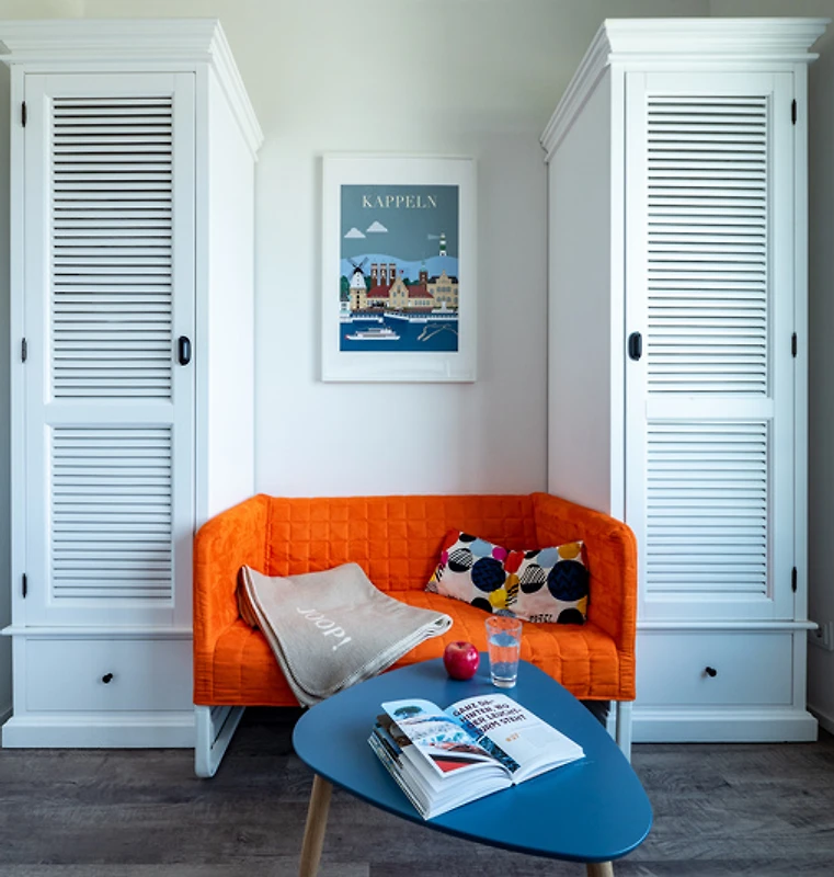 Bei dieser Wohnung sind spektakuläre Sonnenlichtspiele durch die zwei Balkone in Süd- und Nordausrichtung zu erwarten. Der Einrichtungsstil entspricht der exklusiven Lage der Ferienwohnung: Landhausstil gepaart mit klaren Farben und Formen versprechen Ruhe und Rückzug, während einzelne Farbakzente für erfrischende Leichtigkeit sorgen.