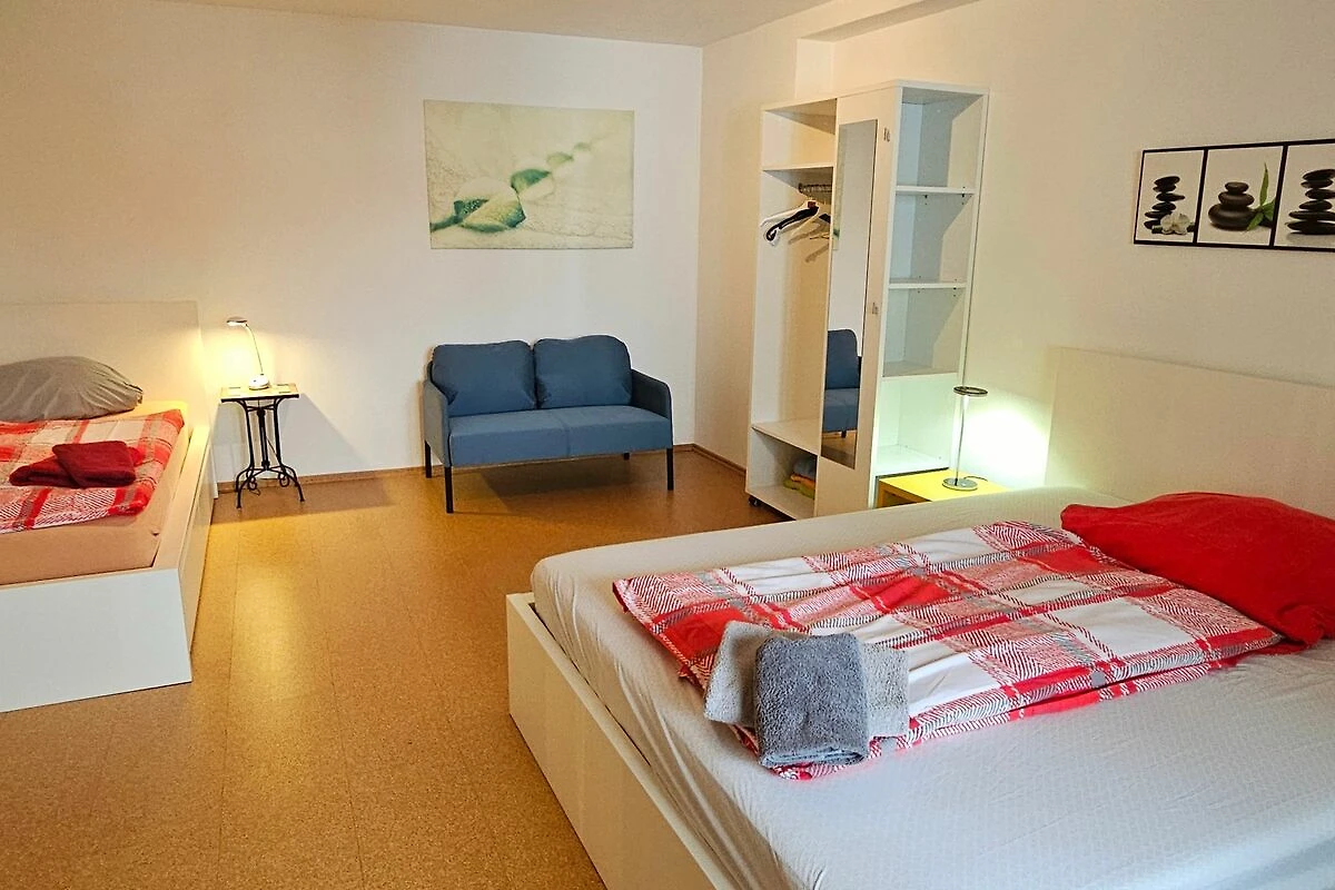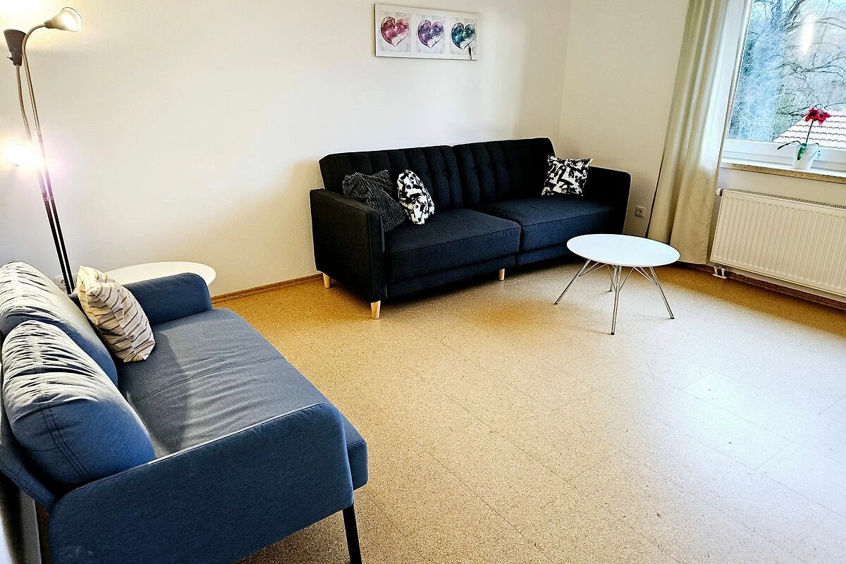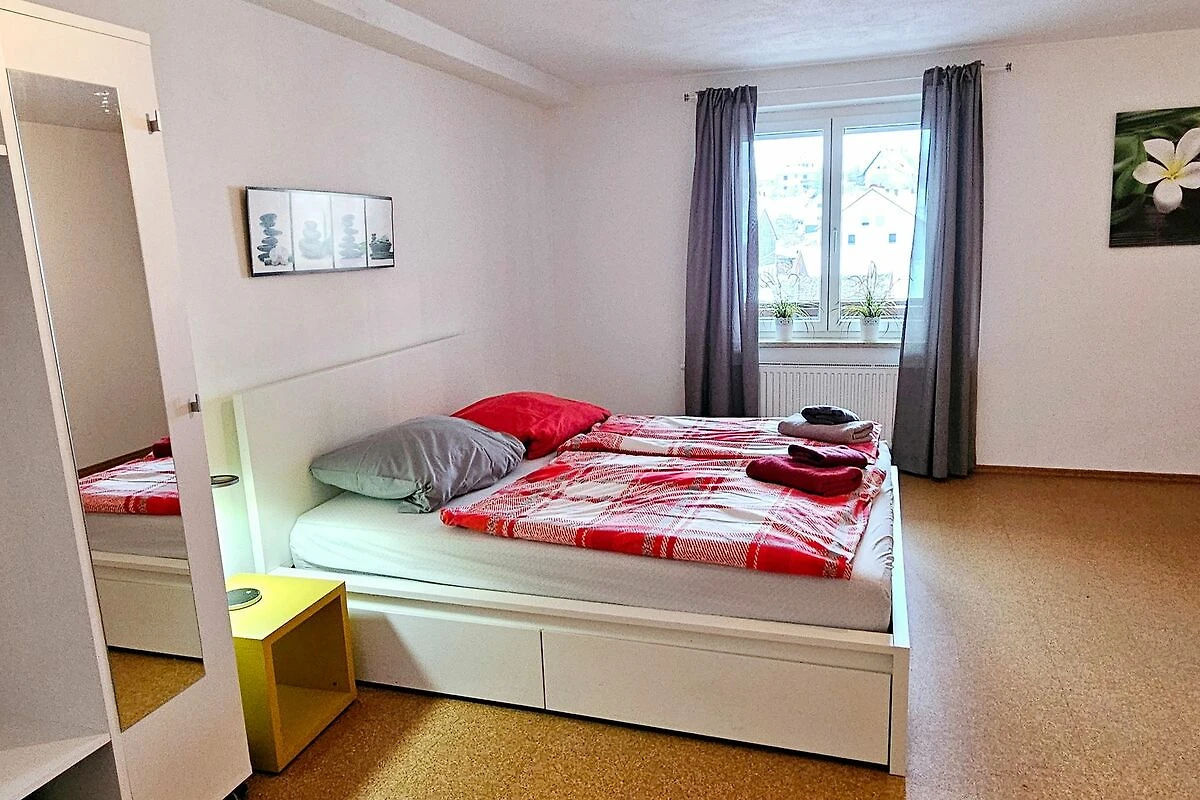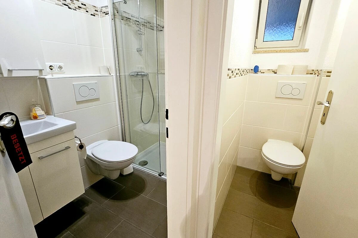 Die Ferienwohnung bietet ein Schlafzimmer mit komfortablem, französischem Bett und einem Einzelbett. Zusätzliche Schlafmöglichkeiten auf der ausklappbaren Couch im Wohnzimmer, ideal für Familien mit Kindern. Ein zusätzliches Gäste-WC sorgt für mehr Flexibilität. Der Allergiker geeignete Bodenbelag aus Laminat und der Sichtschutz an den Fenstern garantieren für Wohlbefinden und Privatsphäre, während der zentrale Heizungsservice die Wohnung zu jeder Jahreszeit heimelig macht.