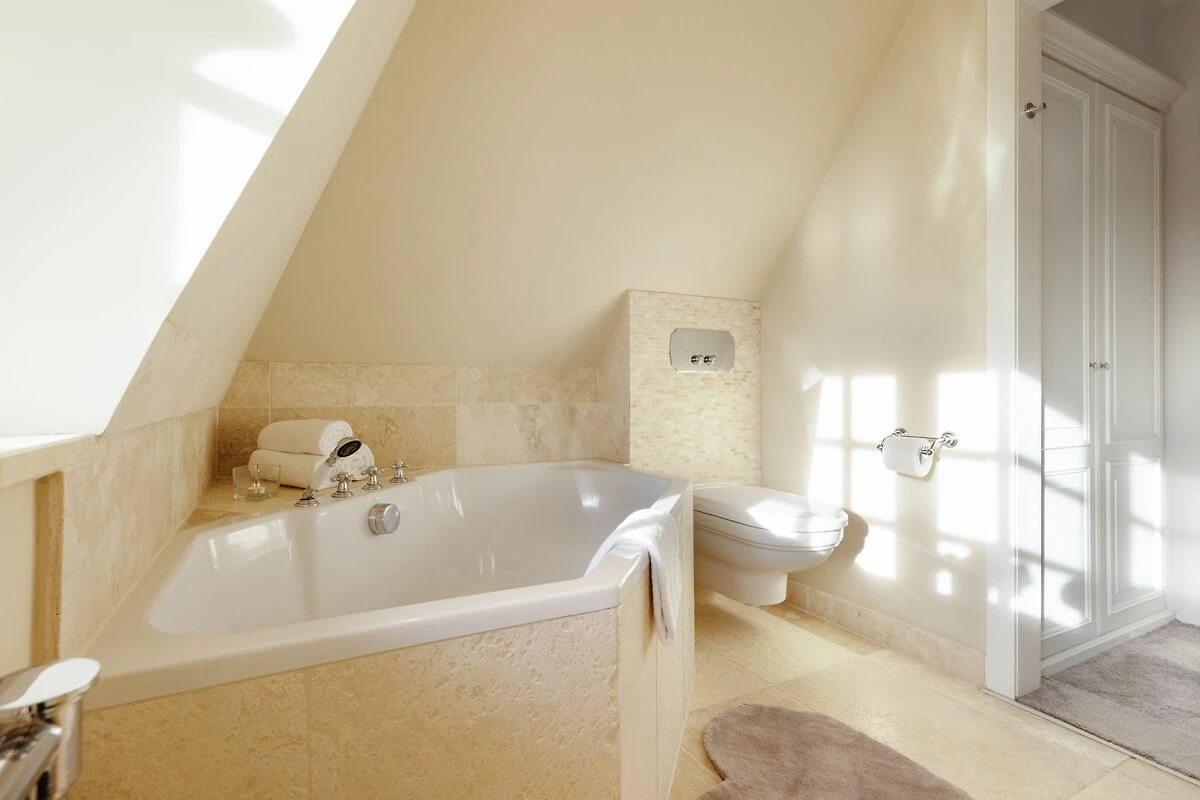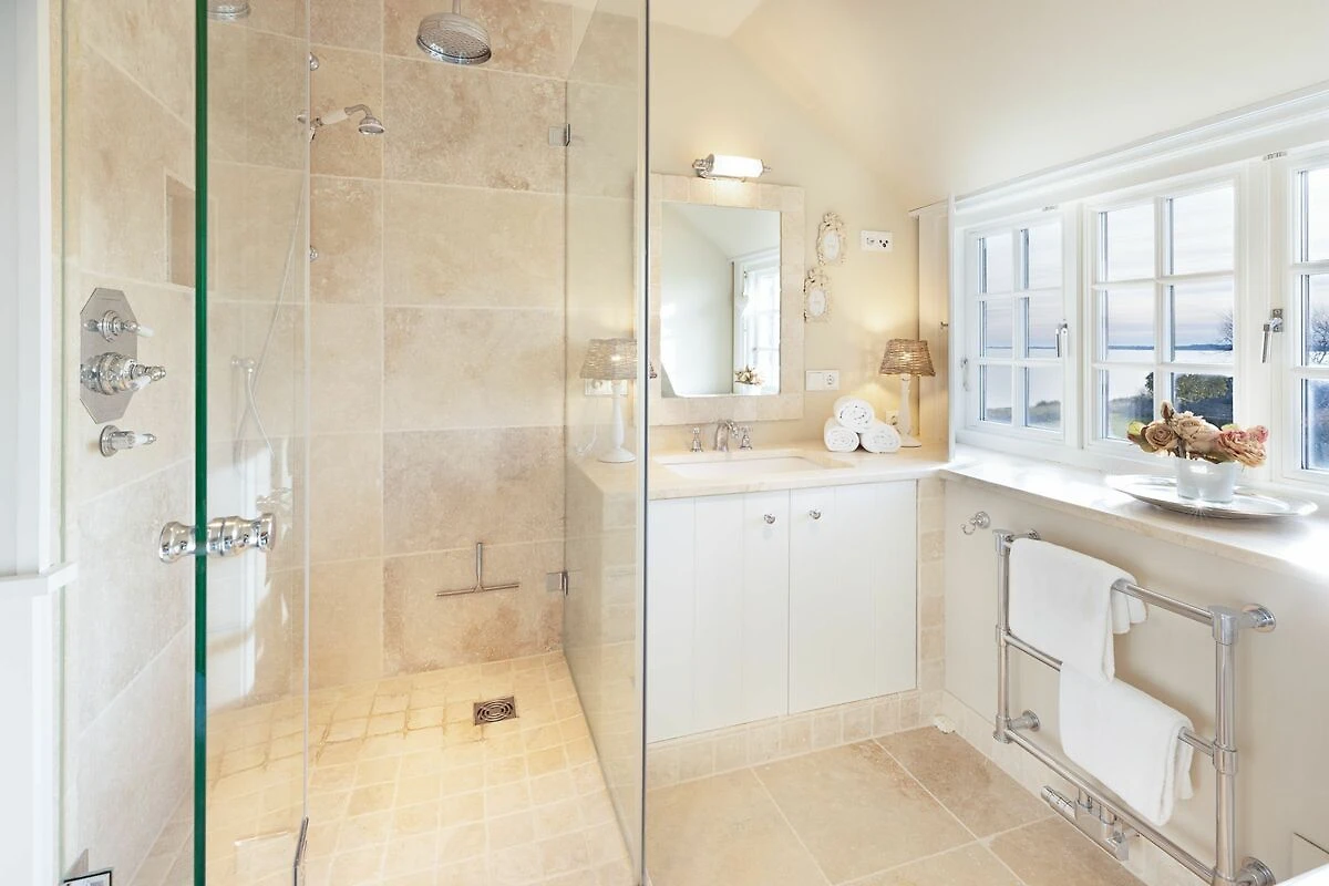 Es gibt zwei moderne Badezimmer, ausgestattet mit einer Dusche und einer Badewanne und zusätzlich steht ein Gäste-WC zur Verfügung.