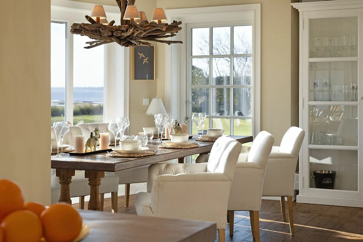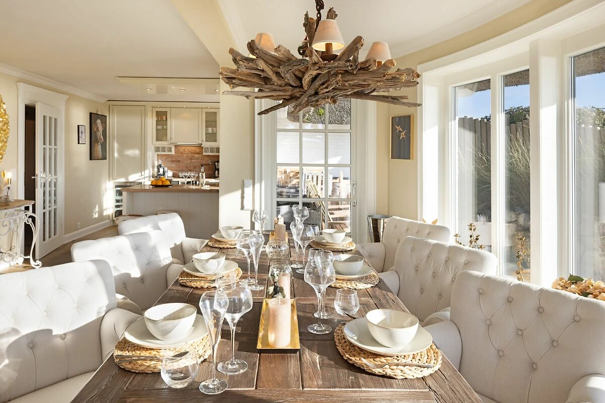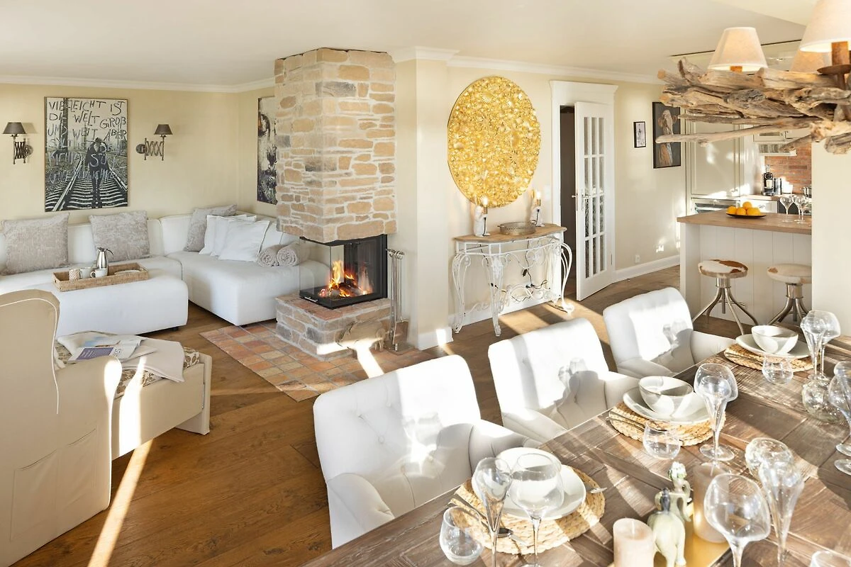 Die offene Küche ist modern gestaltet und verfügt über alle notwendigen Geräte, darunter ein Cerankochfeld, einen Backofen und eine Spülmaschine. Genießen Sie gesellige Kochabende am großen Esstisch, der nahtlos in den Wohnbereich übergeht. Der Wohnraum ist stilvoll mit Parkett ausgestattet und lädt mit einer gemütlichen Sofaecke und einem offenen Kamin zu entspannten Stunden ein. Für Unterhaltung sorgt ein hochmodernes Entertainment-System mit vier Fernsehern und einer schnellen Internetverbindung über WLAN.