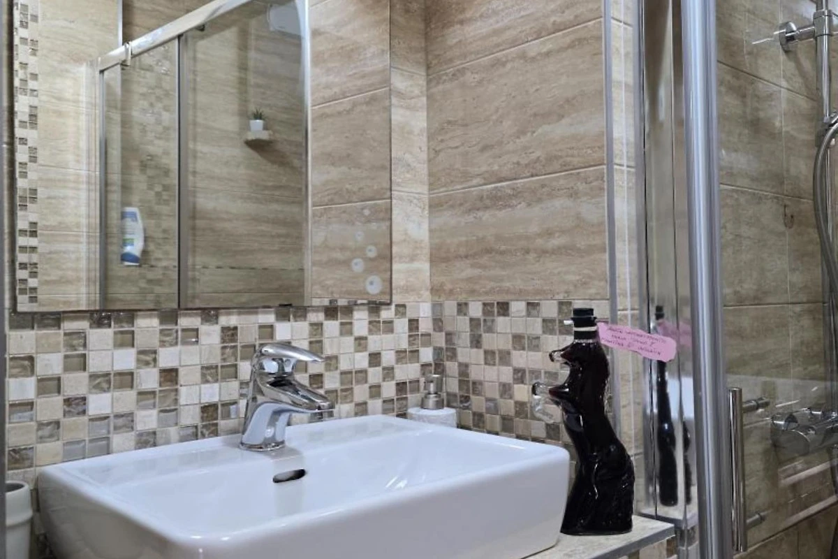 This studio apartment can accommodate up to two guests. It features a satellite TV and is combined with a living room seating area, a sofa, and a kitchen. The private bathroom is equipped with a walk-in shower and toilet.