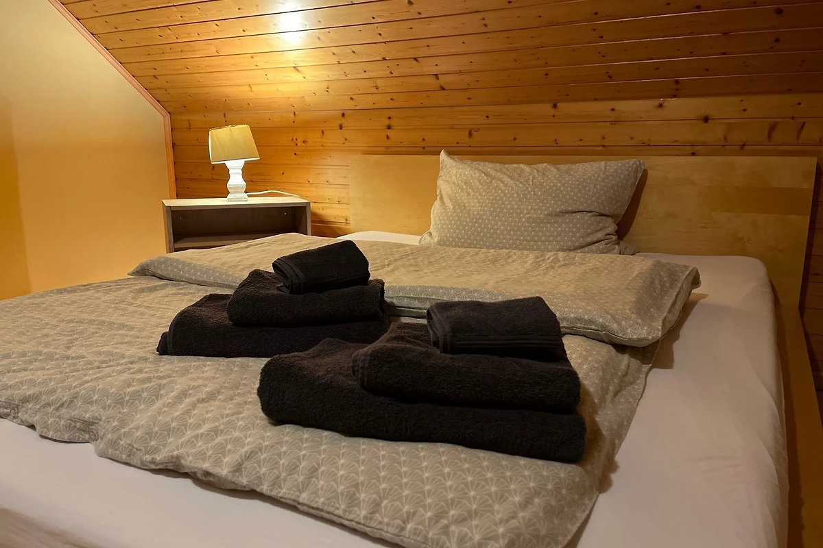 Im Obergeschoss finden Sie ein weiteres Schlafzimmer mit einem bequemen französischen Bett (160 x 200 cm) und ein praktisches Gäste-WC. Für Familien stehen ein Hochstuhl und ein Reisebett bereit.
