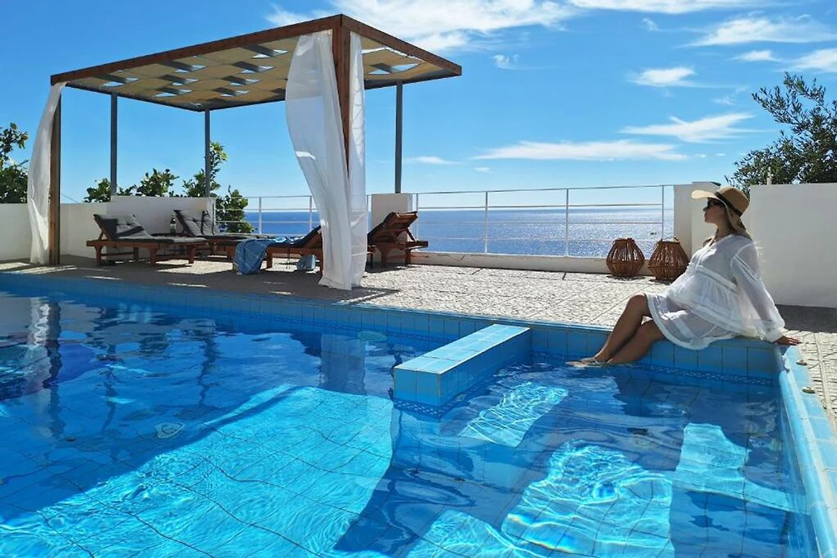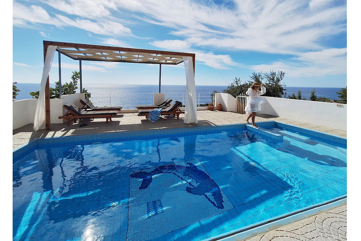 Der private Swimmingpool mit Sonnenliegen und schattiger Pergola und der traumhafte Meerblick lässt keine Wünsche offen.