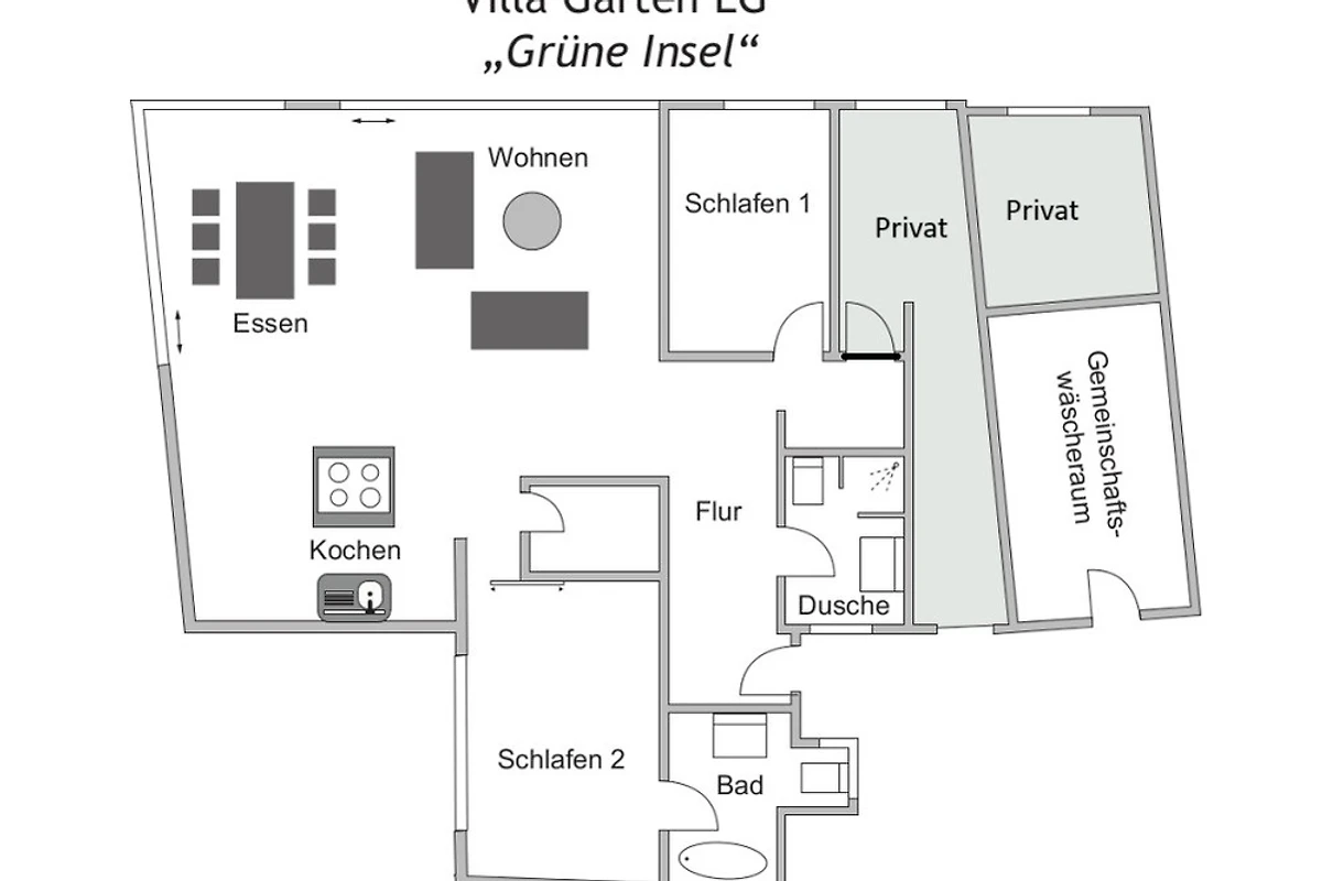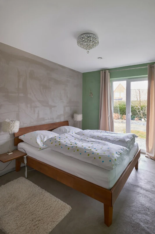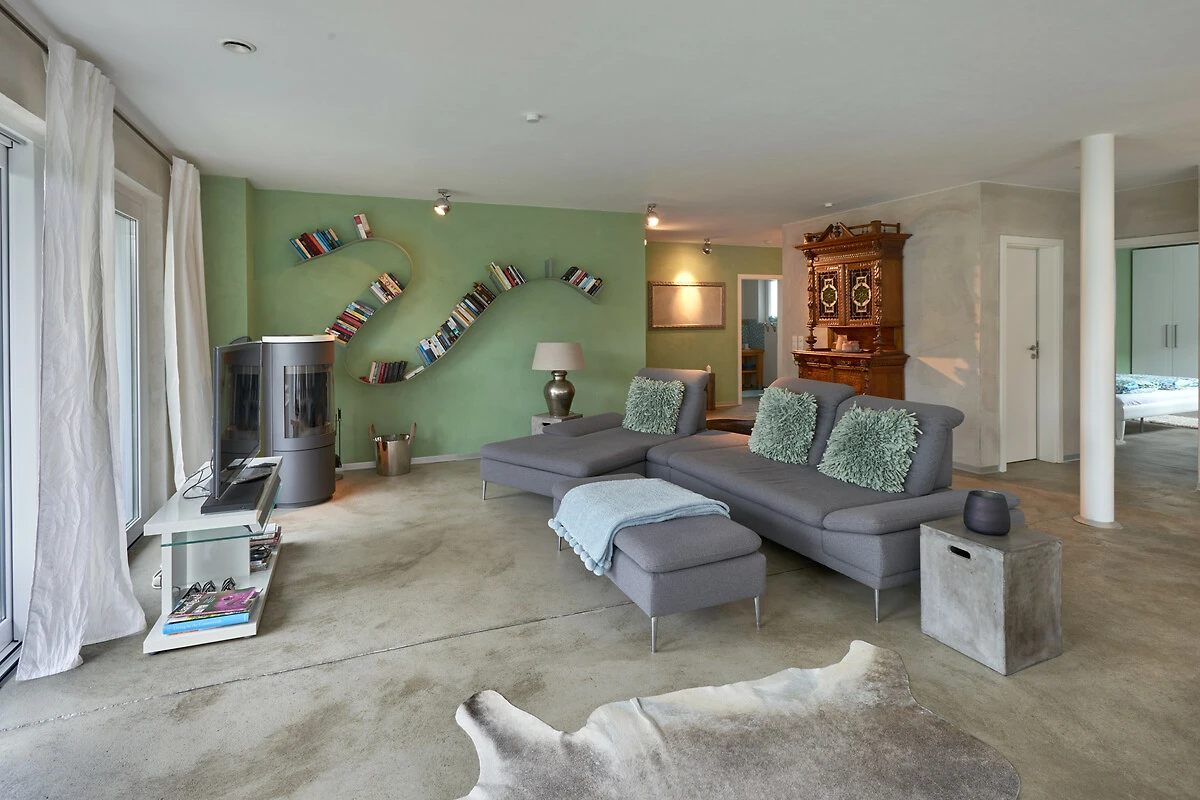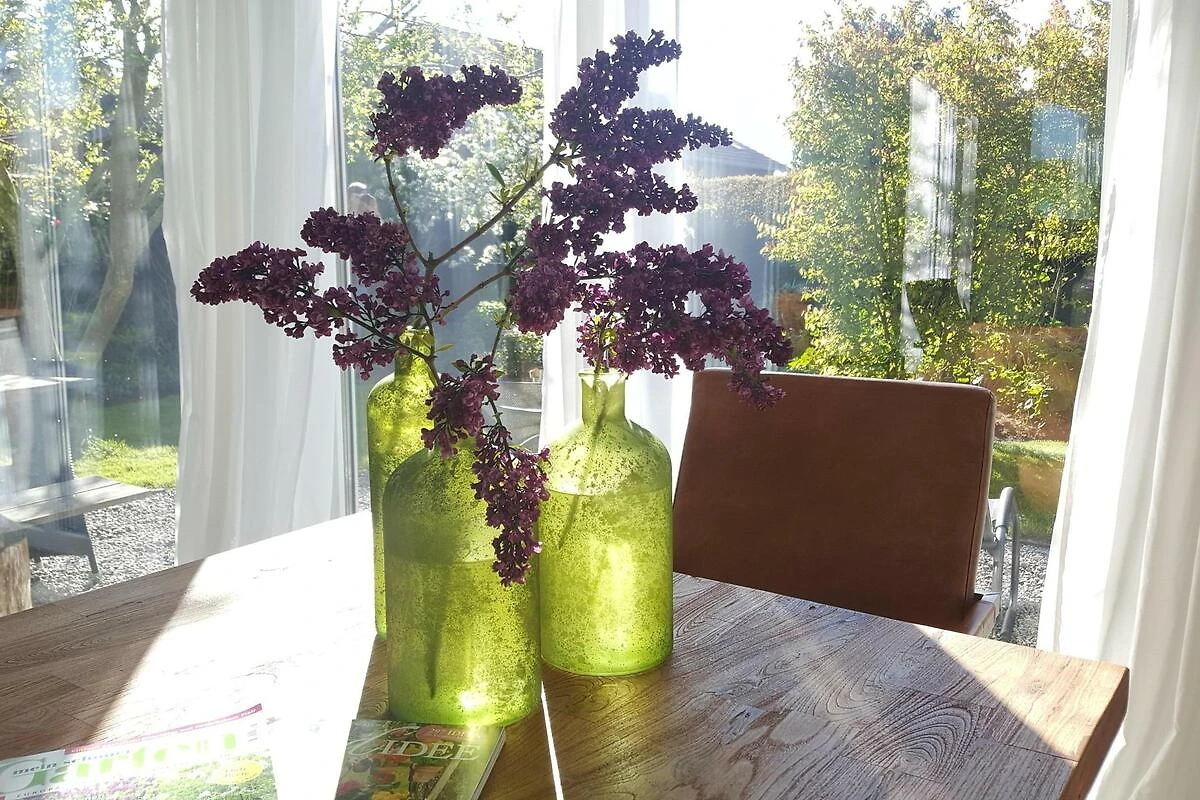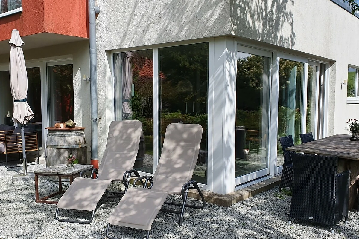 Die Wohnung im EG verfügt über 120 qm Wohnfläche und bietet bis zu 4 Personen viele Möglichkeiten an schönen Plätzen zu entspannen oder sich kreativ im großen Kochen-Essen-Wohnen-Bereich zu betätigen. Die riesigen Fensterflächen erwecken den Eindruck im Grünen zu leben – selbst wenn das Wetter nicht mitspielen sollte. Im Winter macht man es sich vor dem Kaminofen und in der Gartensauna gemütlich, im Sommer auf den großzügigen Terrassen des blühenden Staudengartens. Es gibt zwei Schlafzimmer mit hochwertigen Komfortbetten. Jedes verfügt über ein eigenes Bad. Geschmackvolle Möbel, modern, kombiniert mit Antiquitäten und sanfte Einrichtungsfarben geben der Wohnung ein stilvolles Ambiente. Die moderne, großzügige Küche ist bestens ausgestattet. Hobbyköche können hier nach Belieben schalten und walten. Ganz sicher werden Sie sich wohl fühlen...