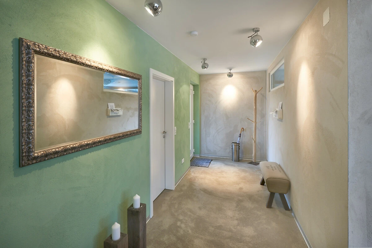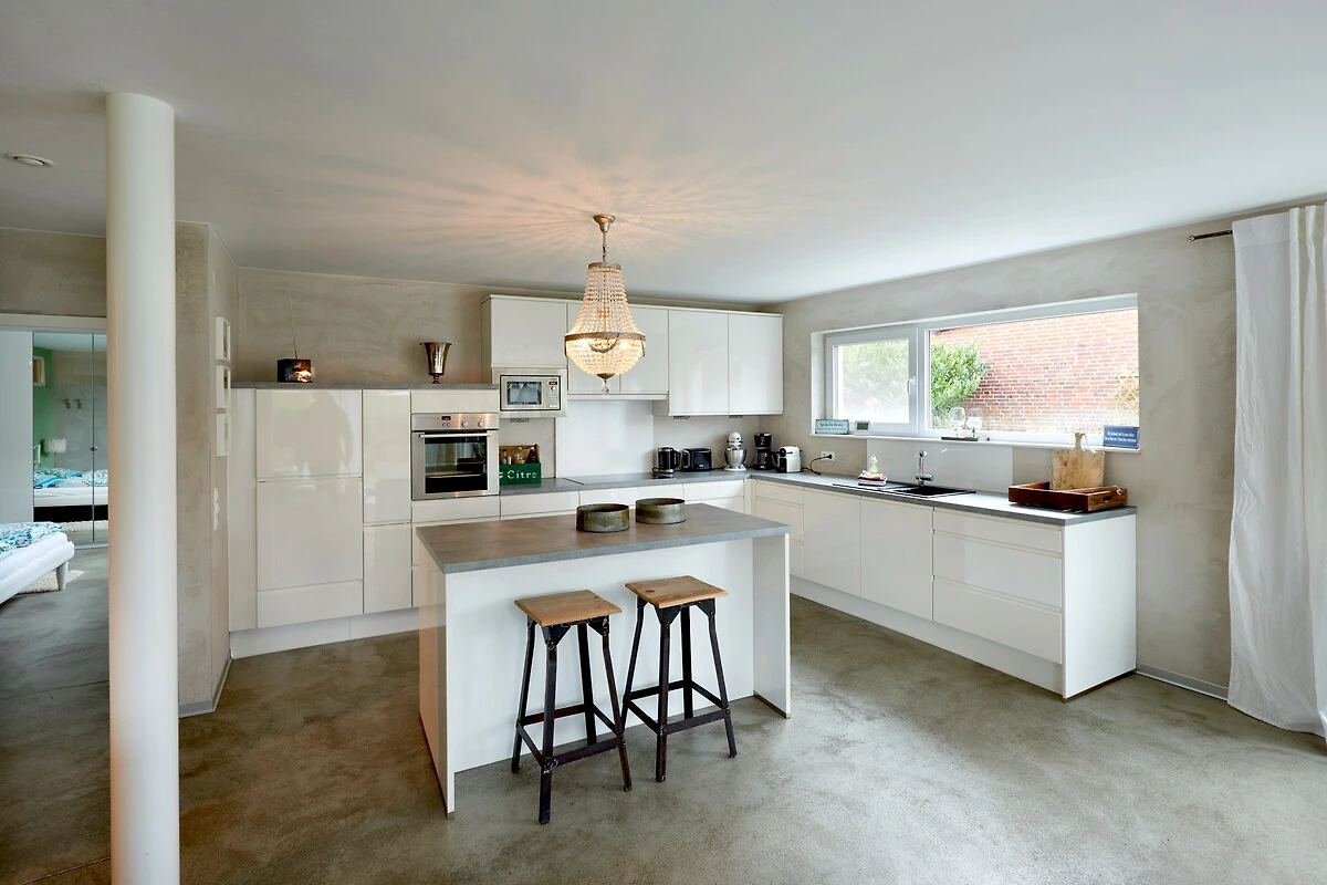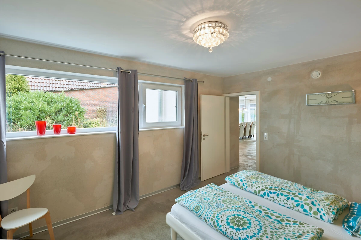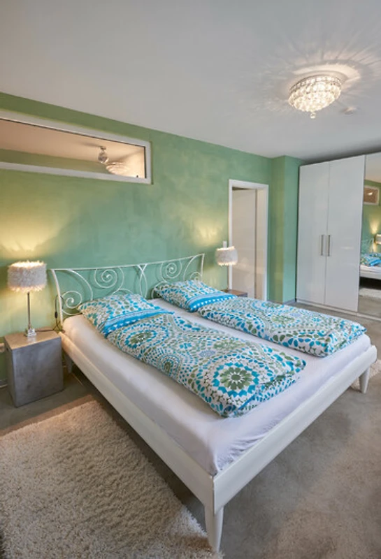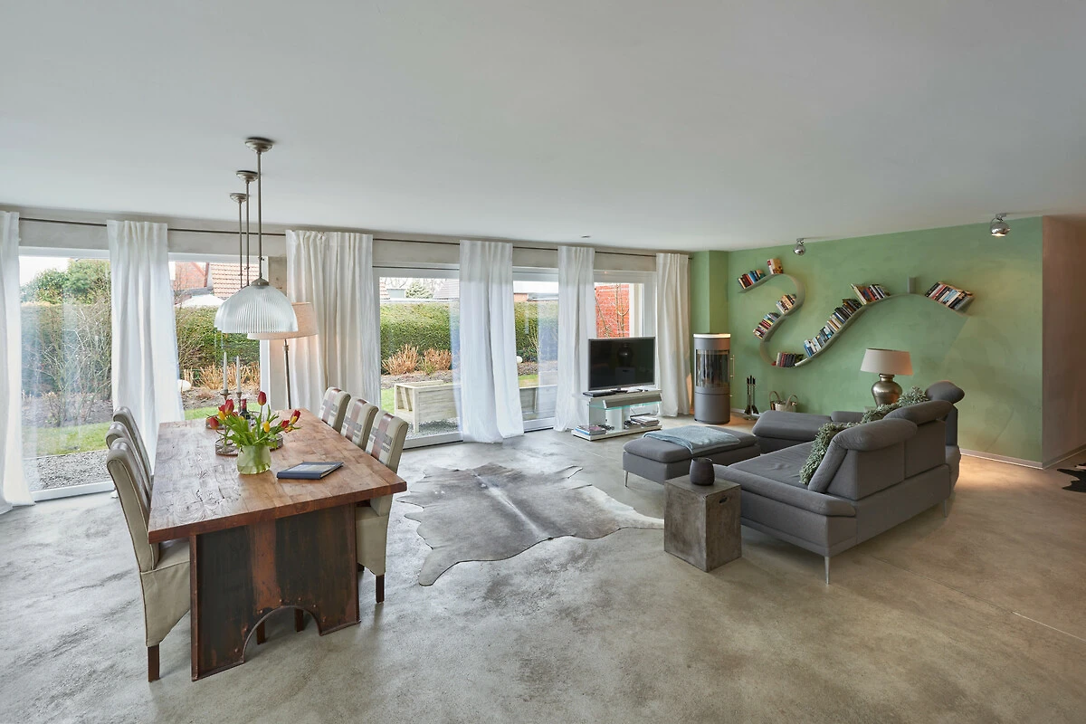 Die Wohnung im EG verfügt über 120 qm Wohnfläche und bietet bis zu 4 Personen viele Möglichkeiten an schönen Plätzen zu entspannen oder sich kreativ im großen Kochen-Essen-Wohnen-Bereich zu betätigen. Die riesigen Fensterflächen erwecken den Eindruck im Grünen zu leben – selbst wenn das Wetter nicht mitspielen sollte. Im Winter macht man es sich vor dem Kaminofen und in der Gartensauna gemütlich, im Sommer auf den großzügigen Terrassen des blühenden Staudengartens. Es gibt zwei Schlafzimmer mit hochwertigen Komfortbetten. Jedes verfügt über ein eigenes Bad. Geschmackvolle Möbel, modern, kombiniert mit Antiquitäten und sanfte Einrichtungsfarben geben der Wohnung ein stilvolles Ambiente. Die moderne, großzügige Küche ist bestens ausgestattet. Hobbyköche können hier nach Belieben schalten und walten. Ganz sicher werden Sie sich wohl fühlen...