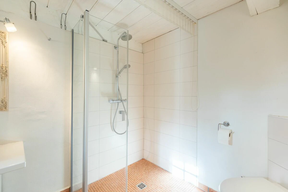 Das moderne Duschbad verfügt über eine ebenerdige Dusche und einen schönen Waschtisch.