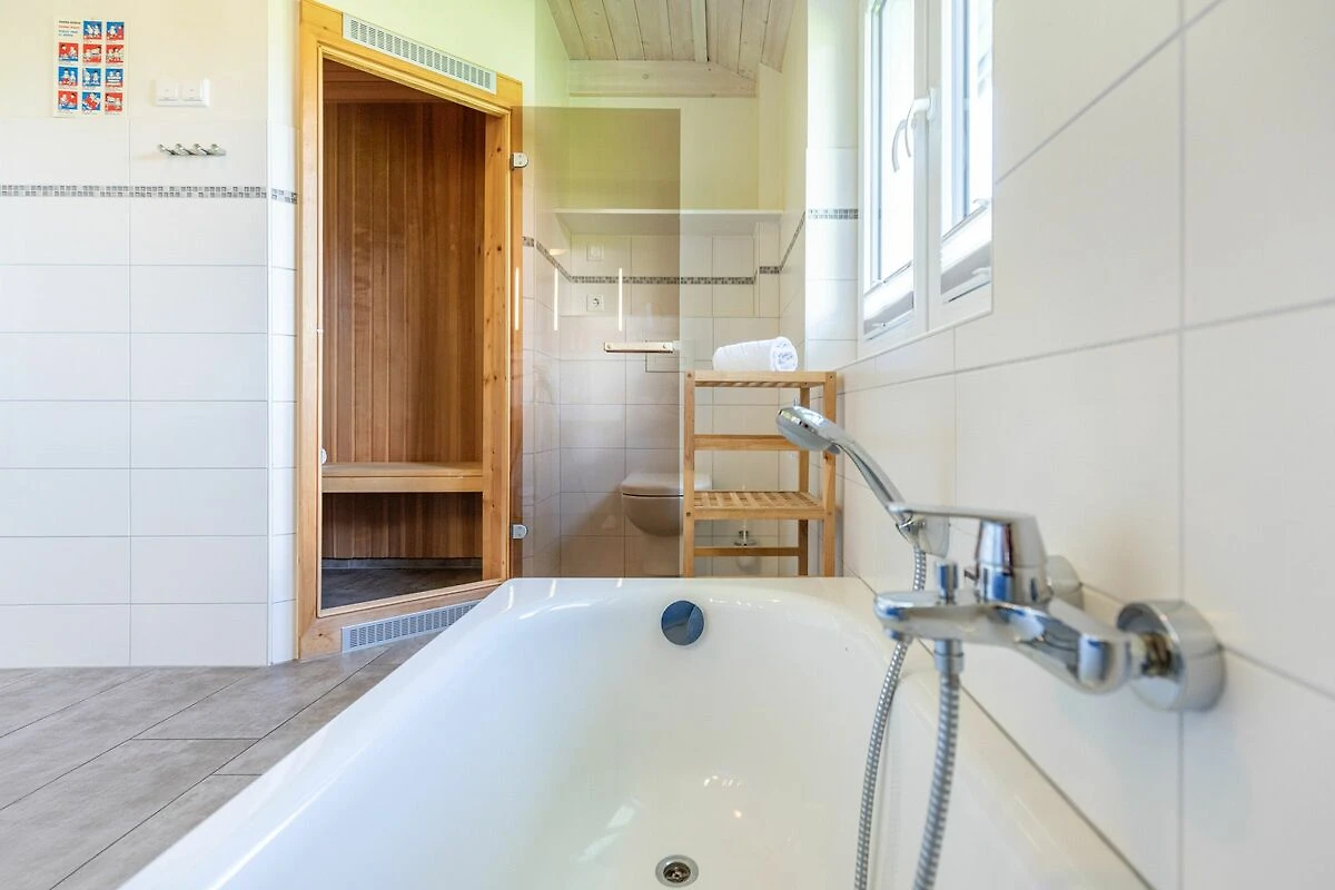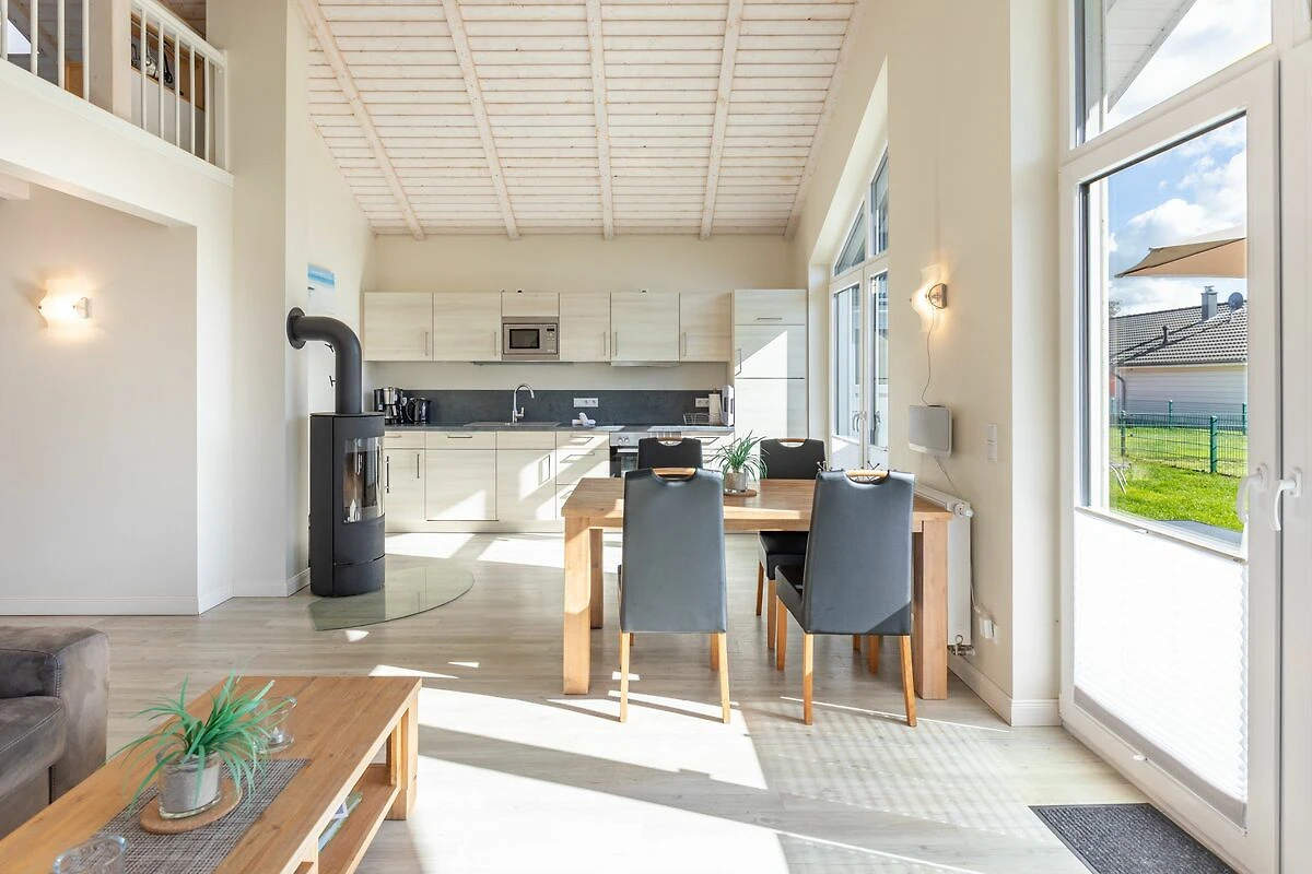 Das gemütliche Wohnzimmer ist mit SAT-TV ausgestattet. Der Kaminofen sorgt auch in der kälteren Jahreszeit für behagliche Stunden. Die offene Küche bietet Ihnen eine exklusive und umfangreiche Ausstattung, die das Herz eines jeden Hobbykochs höher schlagen lässt: Ceranfeld mit 4 Kochplatten, Backofen, Kühlschrank mit ***Gefrierfach, Mikrowelle, Geschirrspüler, Filterkaffeemaschine uvm. Das Badezimmer lässt keine Wünsche offen: zwei Waschbecken, eine große Badewanne, eine ebenerdige Dusche und eine schöne Sauna geben Ihrem Urlaub den richtigen Rahmen. Das Ferienhaus verfügt über ein zusätzliches WC. Auf der überdachten Terrasse können Sie auf bequemen Gartenstühlen und -liegen die Sonne genießen.