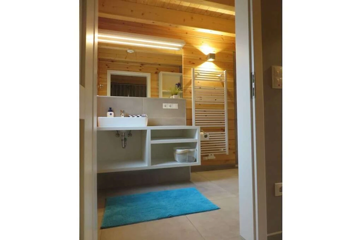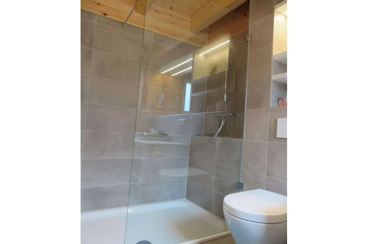 - 1 Badezimmer im OG mit Dusche, WC, Waschbecken, Radio und Fußbodenheizung