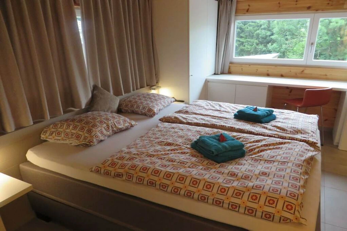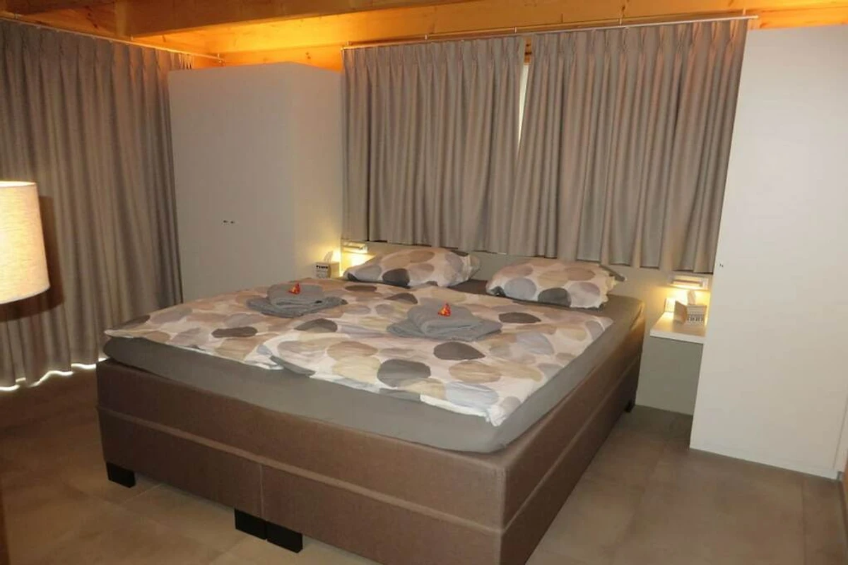 - 1 Schlafzimmer im EG mit Boxspringbett 180x200, Flachbild-TV, Kleiderschrank, Nachttisch und eigenem Badezimmer (Dusche, WC, Waschbecken, Radio) sowie Fußbodenheizung