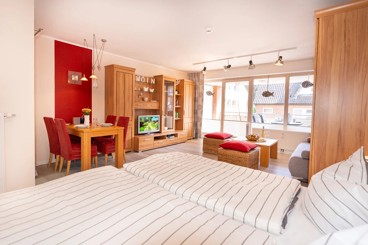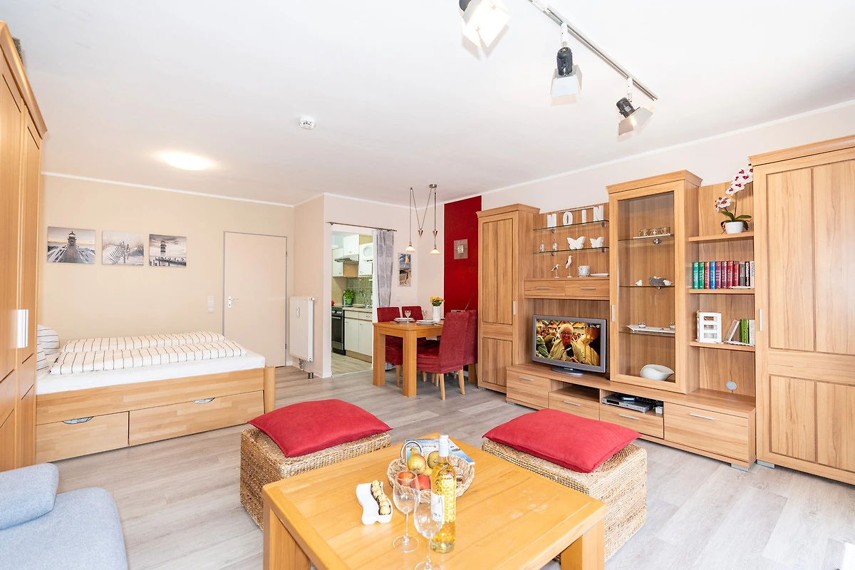 Komfortabel & Kompakt: Ihr Apartment bietet Ihnen alles, was Sie für einen erholsamen Urlaub brauchen: ein gemütliches Zimmer, eine separate, voll ausgestattete Einbauküche (mit allem, was Sie zum Kochen benötigen!), eine Diele und ein eigenes Bad.