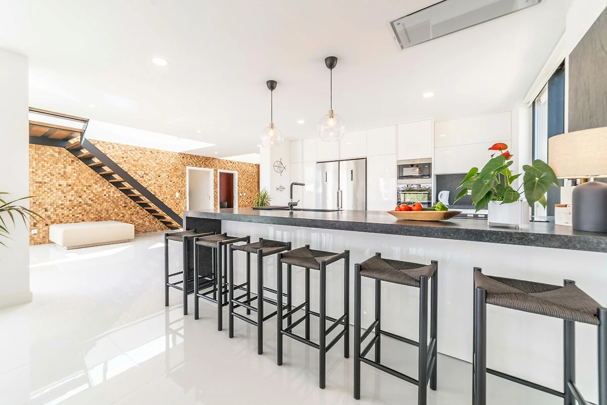 Dieses offene küche, ist ausgestattet in kühlschrank, mikrowelle, backofen, gefrierschrank, spülmaschine, geschirr/besteck, kochutensilien, kaffeemaschine, toaster und wasserkocher.