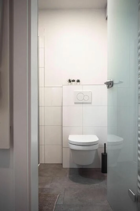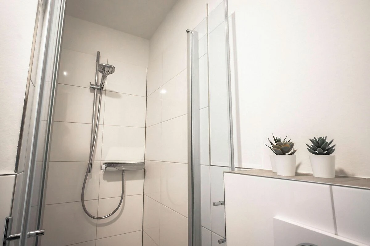 Das Badezimmer ist platzoptimiert und überzeugt mit einer bodengleichen Dusche, einem Waschbecken, WC und einem Spiegel. Für Ihre Sicherheit sind Rauchmelder und ein Feuerlöscher vorhanden. Ein Ganzkörperspiegel sorgt für zusätzlichen Komfort im Alltag.