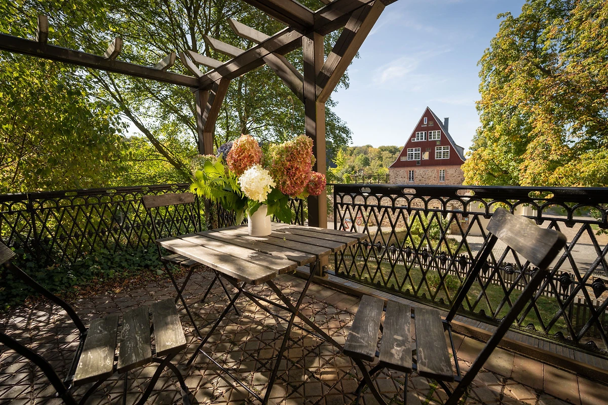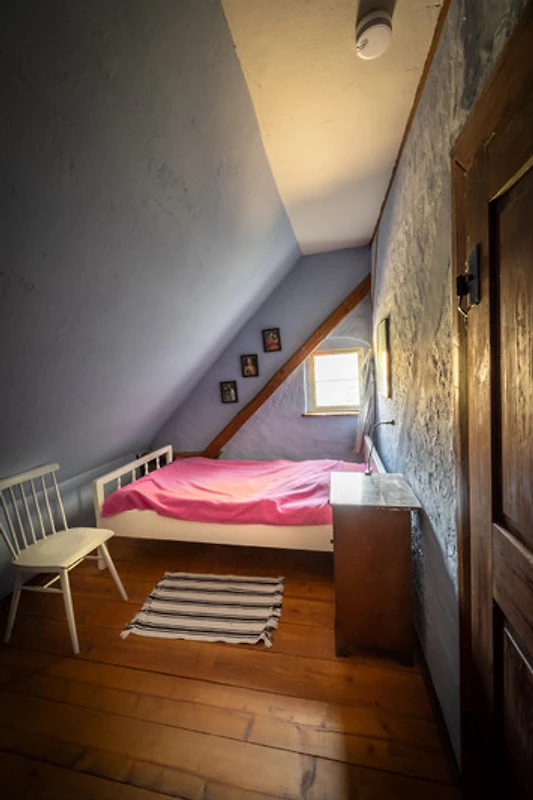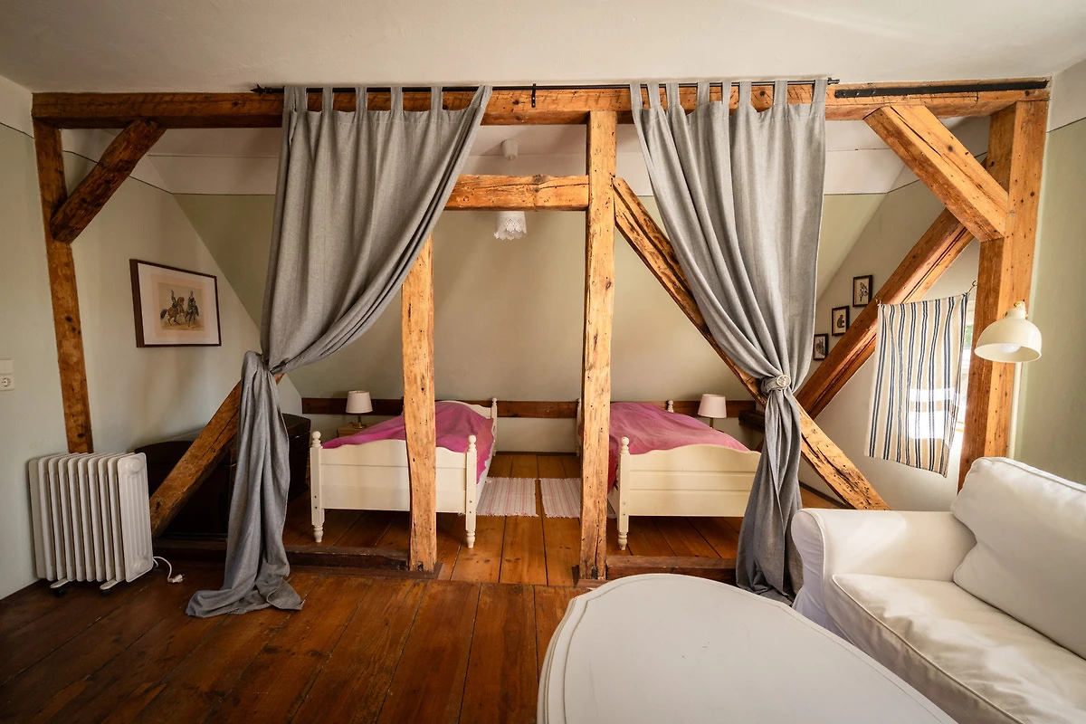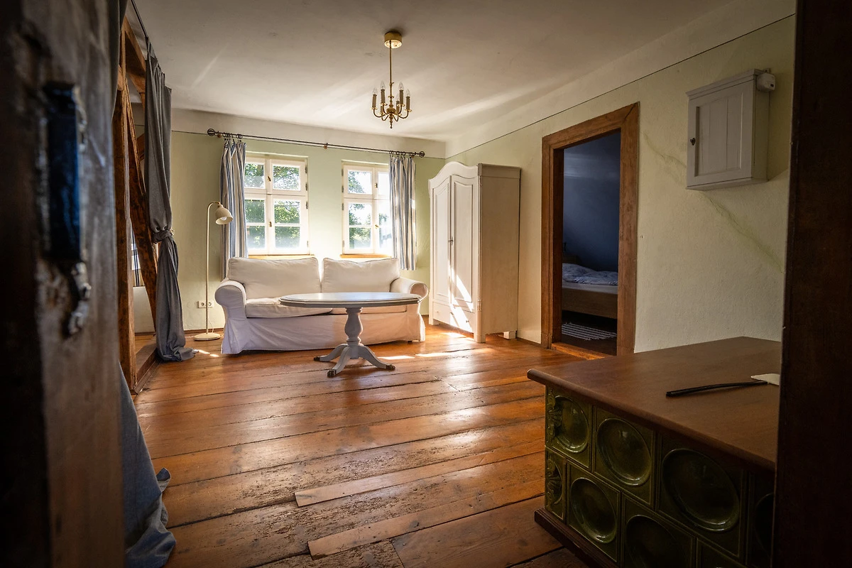 Die Sessel im Vorraum verführen zum Sinnieren, Lesen, Sitzen und Reden. Im Fachwerkraum kann man sich in ein gemütliches Sofa lümmeln, das auch zum Schlafen ausklappt werden kann, wenn die beiden Betten hinter dem Fachwerk nicht ausreichen.