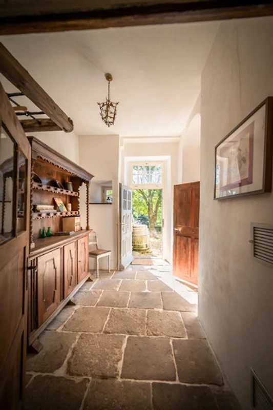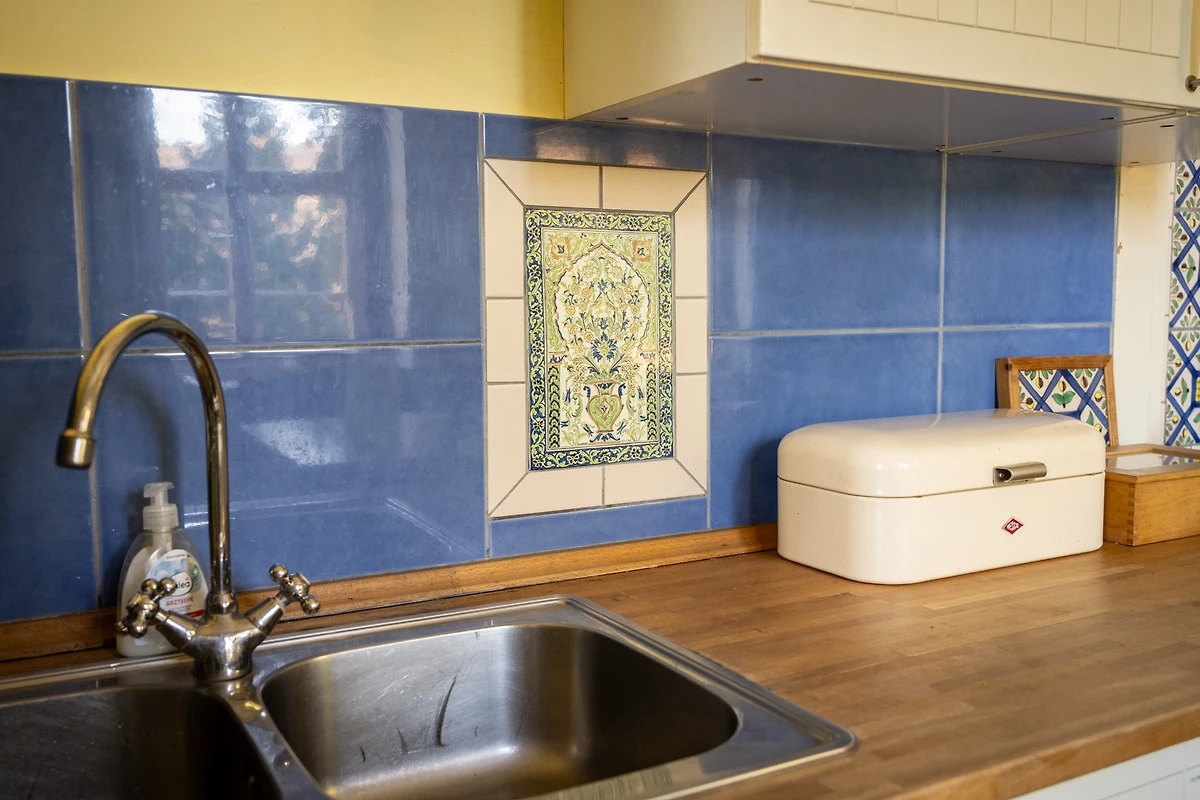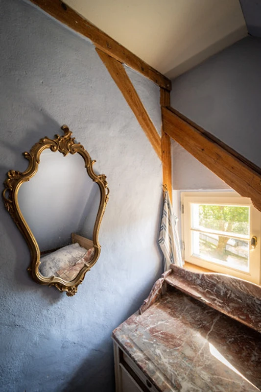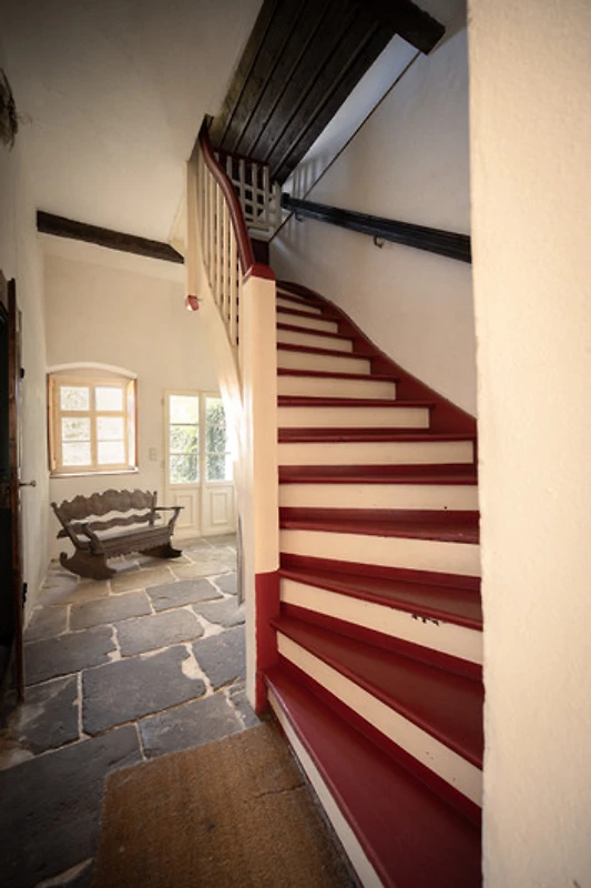 Über unseren urigen, mit Sandsteinplatten belegten Fussboden, der lehmige Kinderfüsse und Gummistiefel aushält, gelangt man in das Bad mit Fussbodenheizung unter den mediterranen Fliesen. Die historische Treppe führt in das Obergeschoss, in dem sich die beiden blauen Schlafkammern befinden. Hier finden sich auch das Babybett und eine Mamorkommode, auf der gewickelt werden kann.