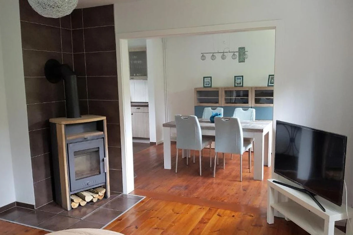 Vom Eingangsbereich aus erreichen Sie über den Flur das gemütliche Wohnzimmer mit Kamin und vorgelagerter Terrasse, die offene sehr gut ausgestattete Küche, und das Duschbad.